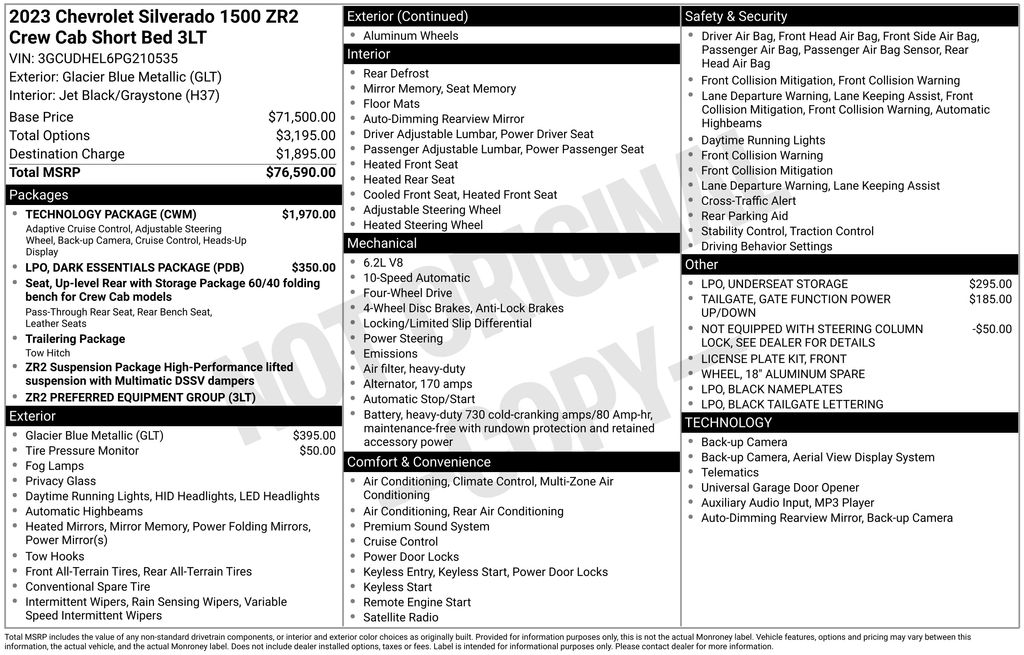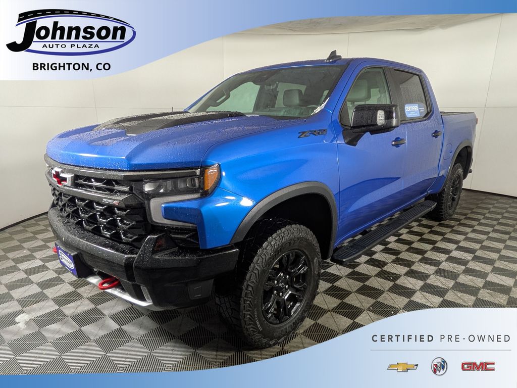 We look forward to serving you! Dark Essentials Package (LPO) (Black Name Plates (LPO) and Black Tailgate CHEVROLET Lettering (LPO)), Preferred Equipment Group 3LT (10-Way Power Driver Seat w/Lumbar, 10-Way Power Passenger Seat Adjuster w/Lumbar, 12.3" Multicolor Reconfigurable Digital Display, 120-Volt Bed Mounted Power Outlet, 120-Volt Instrument Panel Power Outlet, 170 Amp Alternator, 2 USB Data Ports, 2nd Row Heated Outboard Seats, All-Weather Floor Liner (LPO), Auto-Dimming Inside Rear-View Mirror, Auto-Locking Rear Differential, Bed View Camera, Bluetooth® For Phone, Chevrolet Connected Access Capable, Chevytec Spray-On Black Bedliner, Color-Keyed Carpeting Floor Covering, Compass, Deep-Tinted Glass, Driver Memory, Dual Exhaust, Dual Rear USB Ports (Charge Only), Electric Rear-Window Defogger, Electrical Steering Column Lock, Electronic Cruise Control, EZ Lift Power Lock & Release Tailgate, Floor Mounted Center Console, Front LED Fog Lamps, Front Rainsensing Wipers, HD Surround Vision, Heated Driver & Front Outboard Passenger Seats, Heated Steering Wheel, Heavy-Duty Air Filter, High Gloss Black Mirror Caps, Hill Descent Control, Hitch Guidance w/Hitch View, Integrated Trailer Brake Controller, Keyless Open & Start, LED Cargo Area Lighting, Manual Tilt/Telescoping Steering Column, OnStar & Chevrolet Connected Services Capable, Outside Heated Power-Adjustable Mirrors, Performance Red Recovery Hooks, Perimeter Lighting, Power Front Passenger Windows w/Express Up/Down, Power Front Windows w/Driver Express Up/Down, Power Rear Windows w/Express Down, Power Sliding Rear Window w/Rear Defogger, Rear Cross Traffic Alert-Braking, Rear Park Assist, Rear Pedestrian Alert, Rear Wheelhouse Liners, Remote Vehicle Starter System, Safety Alert Seat, SiriusXM w/360L, Standard Tailgate, Steering Wheel Audio Controls, Theft Deterrent System (Unauthorized Entry), Trailer Camera Provisions, Trailer Side Blind Zone Alert, Trailering App, Universal Home Remote, Ventilated Driver & Front Passenger Seats, Wi-Fi Hot Spot Capable, Wireless Charging, Wireless Phone Projection, and Wrapped Steering Wheel), Technology Package (15" Diagonal Multicolor Head-Up Display, Adaptive Cruise Control, Power Tilt & Telescoping Steering Column, and Rear Camera Mirror), Trailering Package (Hitch Guidance), Up-Level Rear Seat w/Storage Package, ZR2 Suspension Package, Chevrolet Certified Pre-Owned Certified, 10-Speed Automatic, 4WD, Jet Black/Graystone Leather, 3.23 Rear Axle Ratio, 4-Wheel Disc Brakes, 7 Speakers, ABS brakes, Air Conditioning, Alloy wheels, AM/FM radio: SiriusXM with 360L, Apple CarPlay/Android Auto, Auto High-beam Headlights, Auto-dimming door mirrors, Auto-dimming Rear-View mirror, Automatic Emergency Braking, Automatic temperature control, Brake assist, Delay-off headlights, Driver door bin, Driver vanity mirror, Dual front impact airbags, Dual front side impact airbags, Electronic Stability Control, Electronic Transmission Range Selector Shifter, Following Distance Indicator, Forward Collision Alert, Front anti-roll bar, Front Bucket Seats, Front Center Armrest, Front dual zone A/C, Front fog lights, Front License Plate Kit, Front Pedestrian Braking, Front reading lights, Front wheel independent suspension, Fully automatic headlights, Garage door transmitter, Heated door mirrors, Heated front seats, Heated rear seats, Heated steering wheel, Illuminated entry, IntelliBeam Automatic High Beam On/Off, Lane Keep Assist w/Lane Departure Warning, Low tire pressure warning, Memory seat, Not Equipped w/Steering Column Lock, Occupant sensing airbag, Outside temperature display,