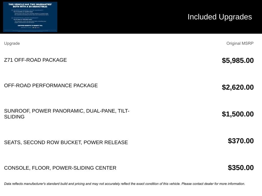We look forward to serving you! Advanced Trailering Package (Hitch Guidance w/Hitch View, Integrated Trailer Brake Controller, and Smart Trailer Integration Indicator), Driver Alert Package (Lane Change Alert w/Side Blind Zone Alert and Rear Cross Traffic Alert), License Plate Front Mounting Package, Luxury Package (2nd Row Pwr Release 60/40 Split-Folding Bench Seat, 3rd Row 60/40 Power-Folding Split-Bench Seat, HD Surround Vision, Heated 2nd Row Outboard Seats, Heated Steering Wheel, Memory Settings, Outside Heated Power-Adjustable Mirrors, Power Tilt & Telescopic Steering Column, and Rear Pedestrian Alert), Max Trailering Package (Extra Capacity Cooling System), Off-Road Capability Package (Air Ride Adaptive Suspension, Electronic Limited-Slip Differential, and Magnetic Ride Control Suspension), Off-Road Performance Package (Dual Exhaust System), Preferred Equipment Group 2Z7 (1st & 2nd Row Color-Keyed Carpeted Floor Mats, 2-Speed Active Electronic AutoTrac Transfer Case, Auto-Dimming Inside Rear-View Mirror, Black Tubular Assist Steps, Bose 9-Speaker Stereo Audio System Feature, Bright Front & Rear Door Sill Plates, Color-Keyed Carpeting Floor Covering, Driver & Front Outboard Passenger Airbags, Enhanced Driver Information Center, Floor Console w/Storage Area, Front High-Approach Angle Fascia, Hands-Free Rear Power Programmable Liftgate, Hill Descent Control, Infotainment Display, LED Daytime Running Lamps, Memory Settings for Driver, Red Horizontal-Mounted Recovery Hooks, Remote Start, SiriusXM Radio w/360L, Universal Home Remote, Wireless Charging, and Wrapped Steering Wheel), Z71 Off-Road Package, Chevrolet Certified Pre-Owned Certified, 4WD, Black Leather, 10-Way Power Driver & Passenger Seat Adjusters, 3.23 Rear Axle Ratio, 3rd row seats: split-bench, 4-Wheel Disc Brakes, 9 Speakers, ABS brakes, Air Conditioning, Alloy wheels, AM/FM radio: SiriusXM with 360L, Apple CarPlay/Android Auto, Auto High-beam Headlights, Auto-dimming Rear-View mirror, Automatic temperature control, Brake assist, Bumpers: body-color, Compass, Delay-off headlights, Driver door bin, Driver vanity mirror, Dual front impact airbags, Dual front side impact airbags, Dual-Pane Power Panoramic Sunroof, Electronic Stability Control, Emergency communication system: OnStar and Chevrolet connected services capable, Floor Console, Four wheel independent suspension, Front anti-roll bar, Front Bucket Seats, Front Center Armrest, Front dual zone A/C, Front High-Back Reclining Bucket Seats, Front reading lights, Fully automatic headlights, Garage door transmitter, Heated door mirrors, Heated Driver & Front Passenger Seats, Heated front seats, Illuminated entry, Leather-Appointed Seat Trim, Low tire pressure warning, Memory seat, Navigation System, Occupant sensing airbag, Outside temperature display, Overhead airbag, Overhead console, Panic alarm, Passenger door bin, Passenger vanity mirror, Power door mirrors, Power driver seat, Power Liftgate, Power passenger seat, Power Release 2nd Row Bucket Seats, Power steering, Power windows, Premi