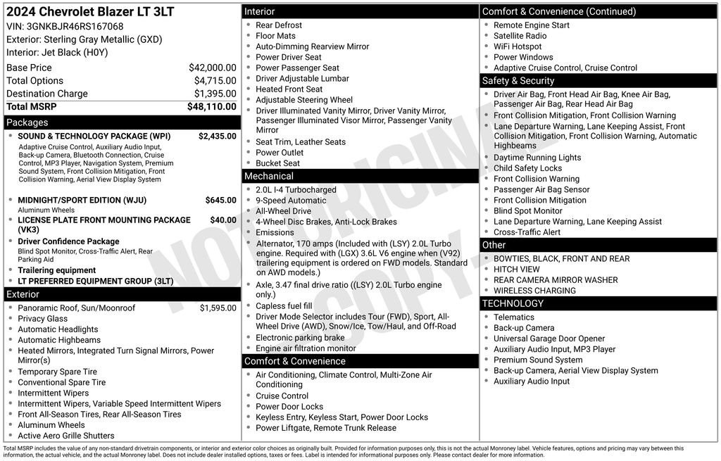 We look forward to serving you! Driver Confidence Package (Lane Change Alert w/Side Blind Zone Alert, Rear Cross Traffic Alert, and Rear Park Assist w/Audible Warning), Midnight/Sport Edition (Front & Rear Black Bowties and Wheels: 18" High Gloss Black Painted Aluminum), Preferred Equipment Group 3LT (6-Way Power Front Passenger Seat Adjuster, Black Roof-Mounted Side Rails, Inside Rear-View Auto-Dimming Mirror, Outside Heated Power-Adjustable Body-Color Mirrors, Rear Power Programmable Liftgate, and Universal Home Remote), Sound & Technology Package (120-Volt Power Outlet, 2 USB Data Ports w/SD Card Reader, Adaptive Cruise Control, Bose Premium 8-Speaker Audio System Feature, Enhanced Automatic Emergency Braking, HD Surround Vision, Radio: Chevrolet Infotainment 3 Premium System, SiriusXM w/360L, and Wireless Charging), Chevrolet Certified Pre-Owned Certified, AWD, 170 Amp Alternator, 3.47 Final Drive Axle Ratio, 4-Wheel Disc Brakes, 6 Speakers, 6-Speaker Audio System Feature, 8-Way Power Driver Seat Adjuster, ABS brakes, Air Conditioning, Alloy wheels, AM/FM radio: SiriusXM with 360L, Apple CarPlay/Android Auto, Auto High-beam Headlights, Auto-dimming door mirrors, Auto-dimming Rear-View mirror, Automatic temperature control, Brake assist, Bumpers: body-color, Child-Seat-Sensing Airbag, Compass, Delay-off headlights, Driver door bin, Driver vanity mirror, Dual front impact airbags, Dual front side impact airbags, Electronic Stability Control, Emergency communication system: OnStar and Chevrolet connected services capable, Four wheel independent suspension, Front anti-roll bar, Front Bucket Seats, Front Center Armrest, Front dual zone A/C, Front reading lights, Fully automatic headlights, Garage door transmitter, Heated door mirrors, Heated Driver & Front Passenger Seats, Heated front seats, Illuminated entry, Knee airbag, Leather Shift Knob, Leather steering wheel, Low tire pressure warning, Occupant sensing airbag, Outside temperature display, Overhead airbag, Overhead console, Panic alarm, Passenger door bin, Passenger vanity mirror, Perforated Leather-Appointed Seat Trim, Power door mirrors, Power Driver Lumbar Control, Power driver seat, Power Liftgate, Power Panoramic Tilt-Sliding Sunroof, Power passenger seat, Power steering, Power windows, Premium audio system: Chevrolet Infotainment 3 Plus, Radio data system, Radio: Chevrolet Infotainment 3 Plus System, Rear anti-roll bar, Rear reading lights, Rear seat center armrest, Rear window defroster, Rear window wiper, Remote keyless entry, Ride & Handling Suspension, Security system, Speed control, Speed-sensing steering, Split folding rear seat, Spoiler, Steering wheel mounted audio controls, Tachometer, Telescoping steering wheel, Tilt steering wheel, Traction control, Trip computer, Turn signal indicator mirrors, Variably intermittent wipers, Voltmeter, and Wheels: 18" Grazen Metallic AluminuM.