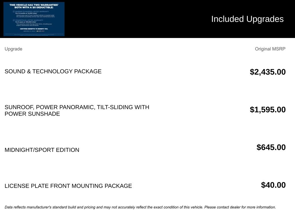 * 24 months/24,000 miles (whichever comes first) Certified Pre-Owned Scheduled Maintenance Plan and 3 days/150 miles (whichever comes first) Vehicle Exchange Program. SiriusXM 3-month trial subscription.