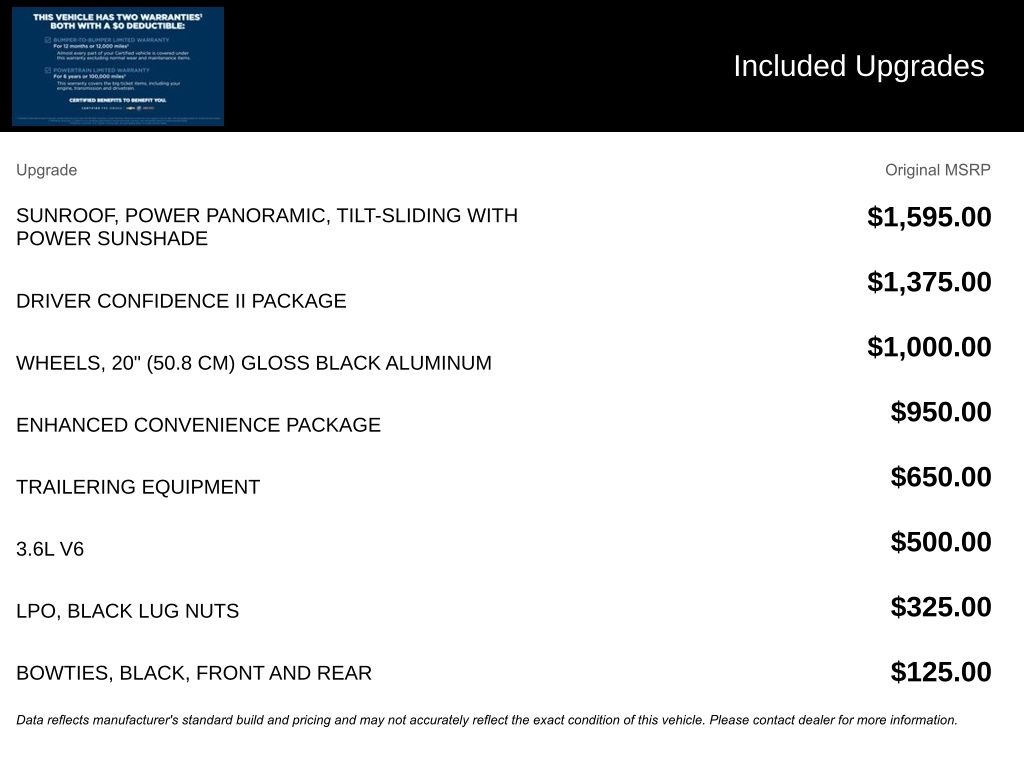We look forward to serving you! Driver Confidence II Package (Adaptive Cruise Control, Enhanced Automatic Emergency Braking, HD Surround Vision, Rear Camera Mirror, Rear Camera Mirror Washer, and Safety Alert Seat), Enhanced Convenience Package (Heated Rear Outboard Seating Positions, Memory Settings For Driver Seat and Exterior Mirrors, Power Tilt and Telescoping Steering Column, and Ventilated Driver and Front Passenger Seats), Preferred Equipment Group 0HD, Trailering Equipment (Hitch Guidance and Hitch View), Chevrolet Certified Pre-Owned Certified, 170 Amp Alternator, 3.47 Final Drive Axle Ratio, 3.49 Final Drive Axle Ratio, 4-Wheel Disc Brakes, 6-Way Power Front Passenger Seat Adjuster, 8 Speakers, 8-Way Power Driver Seat Adjuster, ABS brakes, Air Conditioning, Alloy wheels, AM/FM radio: SiriusXM with 360L, Apple CarPlay/Android Auto, Auto High-beam Headlights, Auto-dimming door mirrors, Auto-dimming Rear-View mirror, Automatic temperature control, Black Lug Nuts, Bose Premium 8-Speaker Audio System Feature, Brake assist, Bumpers: body-color, Child-Seat-Sensing Airbag, Compass, Delay-off headlights, Driver door bin, Driver vanity mirror, Dual front impact airbags, Dual front side impact airbags, Electronic Stability Control, Emergency communication system: OnStar and Chevrolet connected services capable, Four wheel independent suspension, Front and Rear Black Bowties, Front anti-roll bar, Front Bucket Seats, Front Center Armrest, Front dual zone A/C, Front reading lights, Fully automatic headlights, Garage door transmitter, Heated door mirrors, Heated Driver and Front Passenger Seats, Heated front seats, Heated steering wheel, Heavy-Duty Cooling System, Illuminated entry, Knee airbag, Leather Shift Knob, Leather steering wheel, Low tire pressure warning, Navigation System, Occupant sensing airbag, Outside temperature display, Overhead airbag, Overhead console, Panic alarm, Passenger door bin, Passenger vanity mirror, Perforated Leather-Appointed Seat Trim, Power door mirrors, Power Driver Lumbar Control, Power driver seat, Power Liftgate, Power Panoramic Tilt-Sliding Sunroof, Power passenger seat, Power steering, Power windows, Premium audio system: Chevrolet Infotainment 3 Premium, Radio data system, Radio: Chevrolet Infotainment 3 Premium System, Rear anti-roll bar, Rear reading lights, Rear seat center armrest, Rear window defroster, Rear window wiper, Remote keyless entry, Ride and Handling Suspension, Security system, SiriusXM with 360L, Speed control, Speed-sensing steering, Split folding rear seat, Spoiler, Steering wheel mounted audio controls, Stop-Start Engine Control System, Tachometer, Telescoping steering wheel, Tilt steering wheel, Traction control, Trip computer, Turn signal indicator mirrors, Variably intermittent wipers, Voltmeter, Wheels: : 20" Gloss Black Aluminum, and Wheels: 20" Medium Android Machined-Face AluminuM.