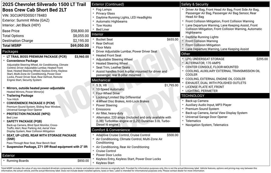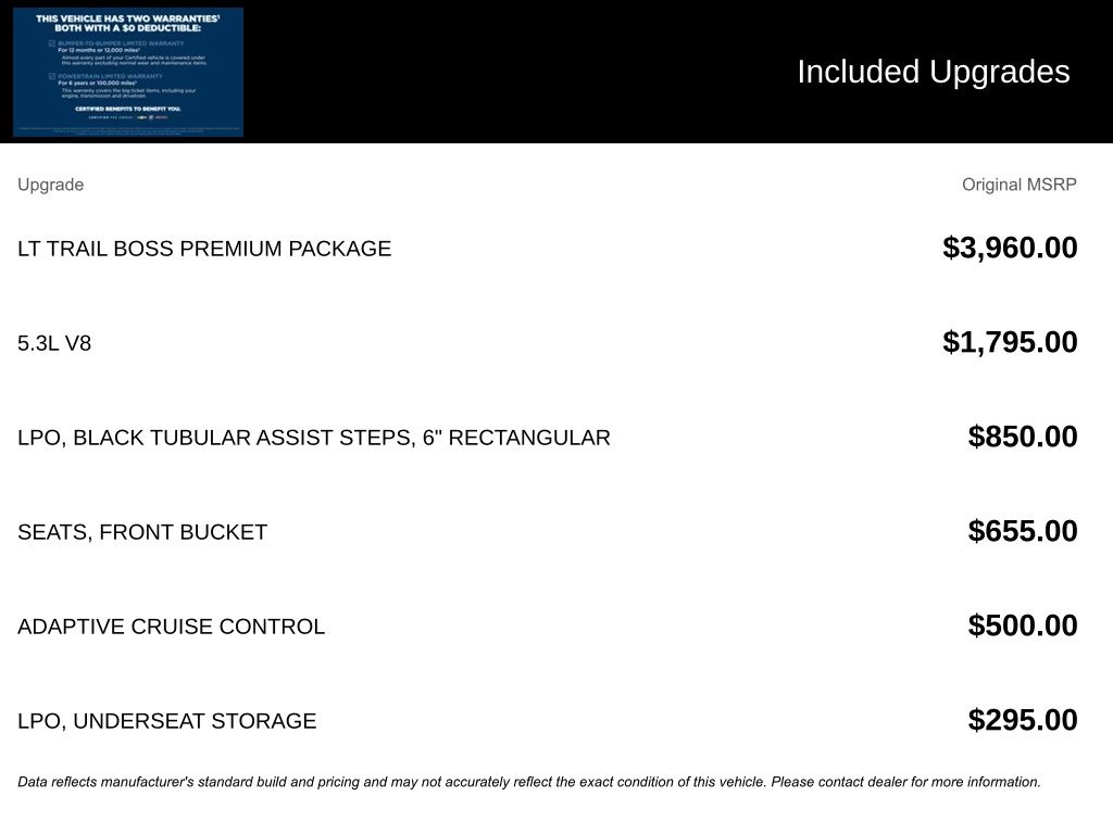 We look forward to serving you! Convenience Package (10-Way Power Driver Seat w/Lumbar, 120-Volt Bed Mounted Power Outlet, 120-Volt Interior Power Outlet, Dual Rear USB Ports (Charge Only), Dual-Zone Automatic Climate Control, Electric Rear-Window Defogger, Heated Driver & Front Outboard Passenger Seats, Heated Steering Wheel, Keyless Open & Start, LED Cargo Area Lighting, Manual Tilt/Telescoping Steering Column, Remote Vehicle Starter System, Theft Deterrent System (Unauthorized Entry), and Wrapped Steering Wheel), Convenience Package II (Hitch Guidance w/Hitch View, In-Vehicle Trailering System App, Power Sliding Rear Window w/Rear Defogger, Premium Bose 7-Speaker Sound System, and Universal Home Remote), Leather Package, LT Trail Boss Premium Package (Power Tailgate), Preferred Equipment Group 2LT (12.3" Multicolor Reconfigurable Digital Display, 6-Speaker Audio System, All-Weather Floor Liner (LPO) (AAK), Auto-Locking Rear Differential, Bluetooth® For Phone, Color-Keyed Carpeting Floor Covering, Deep-Tinted Glass, Electronic Cruise Control, EZ Lift Power Lock & Release Tailgate, Front LED Fog Lamps, HD Rear Vision Camera, Heated Power-Adjustable Outside Mirrors, High Gloss Black Mirror Caps, Inside Rear-View Mirror w/Tilt, Integrated Trailer Brake Controller, OnStar Services Capable, Performance Red Recovery Hooks, Power Front Windows w/Driver Express Up/Down, Power Front Windows w/Passenger Express Down, Power Rear Windows w/Express Down, Rear 60/40 Folding Bench Seat (Folds Up), SiriusXM w/360L Trial Subscription, Standard Tailgate, Steering Wheel Audio Controls, Teen Driver, Tire Pressure Monitoring System, and Wi-Fi Hot Spot Capable), Protection Package (Chevytec Spray-On Black Bedliner and Rear Wheelhouse Liners), Safety Package (HD Surround Vision, Perimeter Lighting, Rear Cross Traffic Braking, Rear Pedestrian Alert, Trailer Camera Provisions, Trailer Side Blind Zone Alert, and Ultrasonic Front & Rear Park Assist), Suspension Package (Heavy-Duty Air Filter and Hill Descent Control), Trailering Package (Hitch Guidance), Up-Level Rear Seat w/Storage Package, 8-Speed Automatic, 4WD, Black Leather, 170 Amp Alternator, 2 USB Data Ports, 220 Amp Alternator, 4-Wheel Disc Brakes, 40/20/40 Front Split-Bench Seat, 6 Speakers, 6" Rectangular Black Tubular Assist Steps (LPO), ABS brakes, Adaptive Cruise Control, Air Conditioning, Alloy wheels, AM/FM radio: SiriusXM with 360L, Apple CarPlay/Android Auto, Auto High-beam Headlights, Automatic Emergency Braking, Automatic temperature control, Auxiliary External Transmission Oil Cooler, Brake assist, Cloth Seat Trim, Compass, Delay-off headlights, Driver door bin, Driver vanity mirror, Dual Exhaust w/Black Exhaust Tips, Dual Exhaust w/Polished Outlets, Dual front impact airbags, Dual front side impact airbags, Electronic Stability Control, Electronic Transmission Range Selector Shifter, Emergency communication system: OnStar, External Engine Oil Cooler, Floor Mounted Center Console, Following Distance Indicator, Forward Collision Alert, Front anti-roll bar, Front Bucket Seats, Front Center Armrest w/Storage, Front dual zone A/C, Front fog lights, Front License Plate Kit, Front Pedestrian Braking, Front reading lights, Front wheel independent suspension, Fully automatic headlights, Heated door mirrors, Heated front seats, Heated steering wheel, Illuminated entry, IntelliBeam Automatic High Beam On/Off, Lane Keep Assist w/Lane Departure Warning, Low tire pressure warning, Occupant sensing airbag, Outside temperature display, Overhead airbag, Overhead console, Panic alarm, Passenger door bin, Passenger vanity mirror, Power door mirrors, Power d
