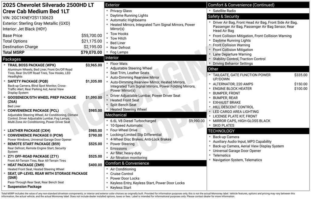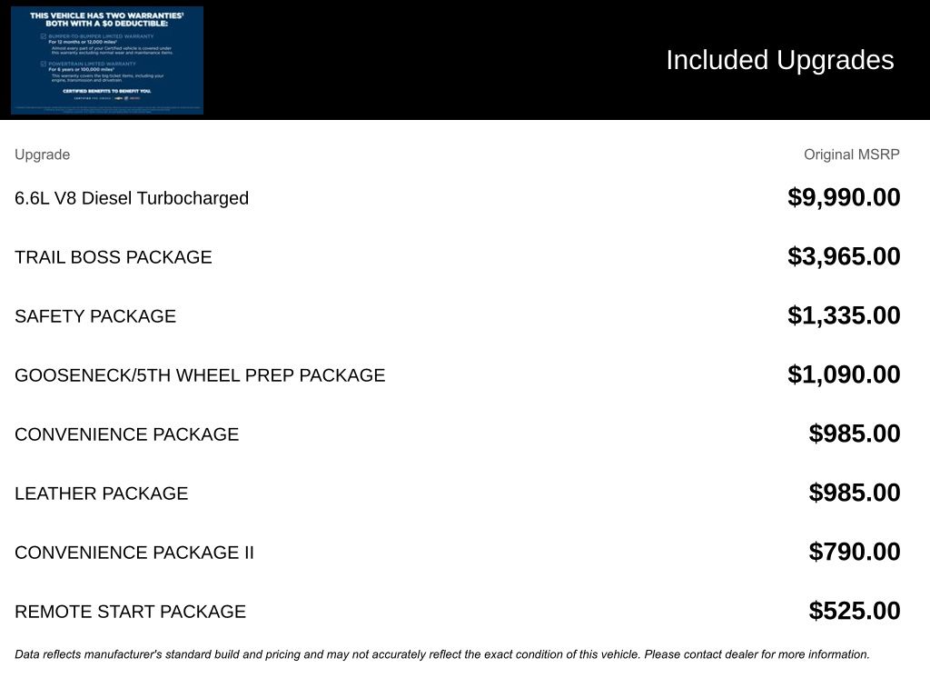 We look forward to serving you! Cloth Rear Seat with Storage Package, Convenience Package (10-Way Power Driver Seat Adjuster with Lumbar, Dual-Zone Automatic Climate Control, Front LED Fog Lamps, LED Cargo Area Lighting, and Manual Tilt and Telescoping Steering Column), Convenience Package II (Hitch Guidance with Hitch View, in-Vehicle Trailering App System, Power Sliding Rear Window with Defogger, and Universal Home Remote), Gooseneck/5th Wheel Prep Package (Black Chevytec Spray-on Bedliner), Heat Package (Heated Driver and Front Outboard Passenger Seating and Heated Steering Wheel), Leather Package, Preferred Equipment Group 1LT (120-Volt Bed Mounted Power Outlet, 120-Volt Interior Power Outlet, 17" Machined Aluminum Wheels, 170 Amp Alternator, 2-Speed Electronic Shift Transfer Case, 4-Way Manual Driver Seat Adjuster, Black Mirror Caps, Bluetooth® For Phone, Chevrolet Connected Access Capable, Color-Keyed Carpeting Floor Covering, Compass, Deep-Tinted Glass, Durabed Pickup Bed, Electronic Cruise Control with Set and Resume Speed, EZ Lift Power Lock and Release Tailgate, Front Rubberized Vinyl Floor Mats, Halogen Reflector Headlamps, HD Rear Vision Camera, Heated Vertical Trailering Mirrors, Keyless Open and Start, OnStar Services Capable, Power Door Locks, Power Front Windows with Driver Express Up/Down, Power Front Windows with Passenger Express Down, Power Rear Windows with Express Down, Push Button Start, Rear 60/40 Folding Bench Seat (folds Up), Rear Rubberized Vinyl Floor Mats, SiriusXM with 360L Trial Subscription, Standard Tailgate, Steering Wheel Audio Controls, Wi-Fi Hotspot Capable, Wireless Phone Projection, and Wrapped Steering Wheel), Remote Start Package (Electric Rear-Window Defogger, Remote Vehicle Starter System, and Unauthorized Entry Theft-Deterrent System), Safety Package (Bed View Camera with Two Trailer Camera Provisions, HD Surround Vision, Rear Cross Traffic Alert, Trailer Camera Provisions, Trailer Side Blind Zone Alert, and Ultrasonic Front and Rear Park Assist), Suspension Package, Trail Boss Package (Animated LED Projector Headlamps, Auto-Dimming Inside Rear-View Mirror, Front Frame-Mounted Red Recovery Hooks, Heated and Auto-Dimming Vertical Trailering Mirrors, High Gloss Black Front Bumper, High Gloss Black Mirror Caps, High Gloss Black Rear Bumper, and Wheels: 20" High Gloss Black Painted), Up-Level Rear Seat with Storage Package, Z71 Off-Road Package (Hill Descent Control), 10-Speed Automatic, 4WD, Black Leather, 220 Amp Alternator, 4-Wheel Disc Brakes, 6 Speakers, 6-Speaker Audio System, 720 Cold-Cranking Amps Heavy-Duty Battery, ABS brakes, Air Conditioning, Alloy wheels, AM/FM radio: SiriusXM with 360L, Apple CarPlay/Android Auto, Auto High-beam Headlights, Body-Color Front Bumper, Body-Color Rear Bumper, Brake assist, Bumpers: chrome, Cloth Seat Trim, Delay-off headlights, Driver door bin, Driver vanity mirror, Dual front impact airbags, Dual front side impact airbags, Electronic Stability Control, Emergency communication system: OnStar, Engine Block Heater, Exhaust Brake, Front 40/20/40 Split-Bench Seats with Lockable Storage, Front anti-roll bar, Front Center Armrest w/Storage, Front License Plate Kit, Front reading lights, Front wheel independent suspension, Fully automatic headlights, Heated door mirrors, Illuminated entry, Low tire pressure warning, Occupant sensing airbag, Outside temperature display, Overhead airbag, Overhead console, Panic alarm, Passenger door bin, Passenger vanity mirror, Power door mirrors, Power steering, Power Up/Down Tailgate Function with Power Lock and Release, Power windows, Premium audio system: Che