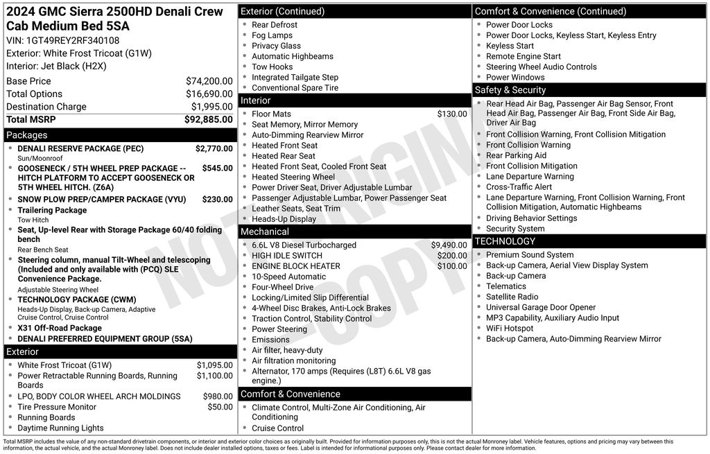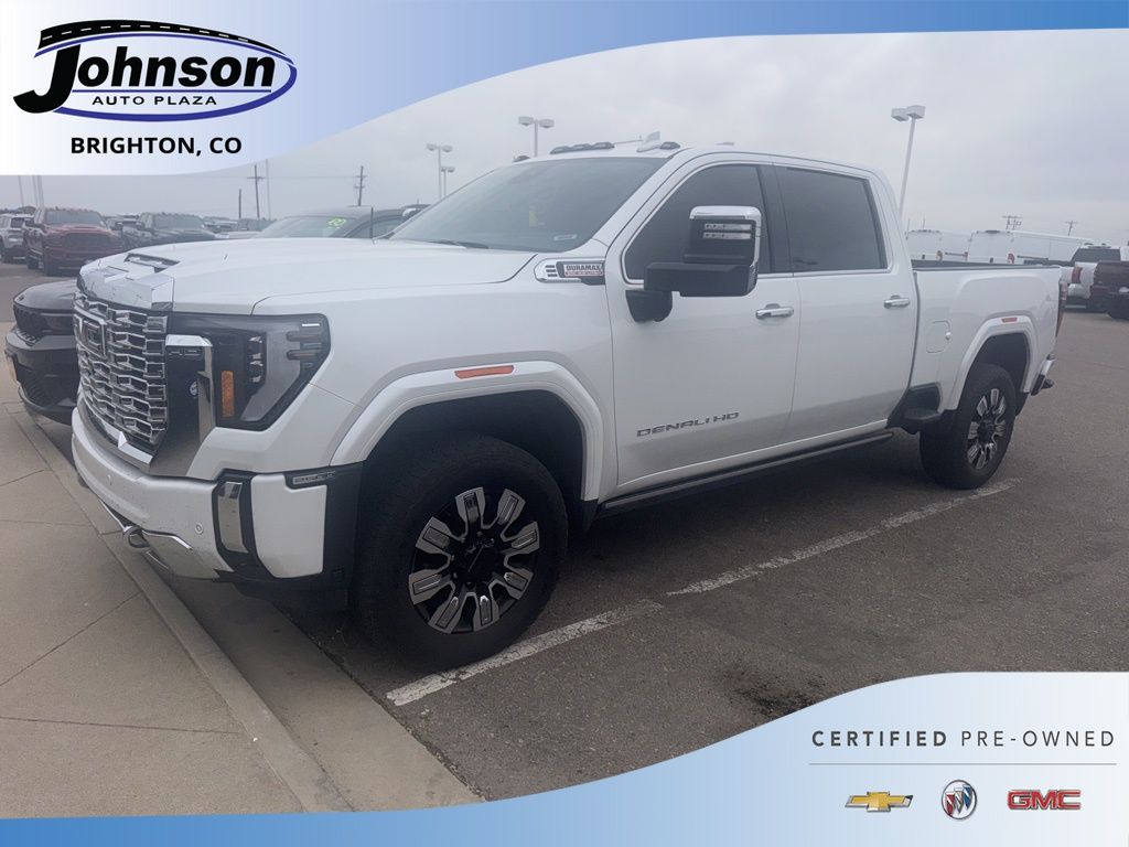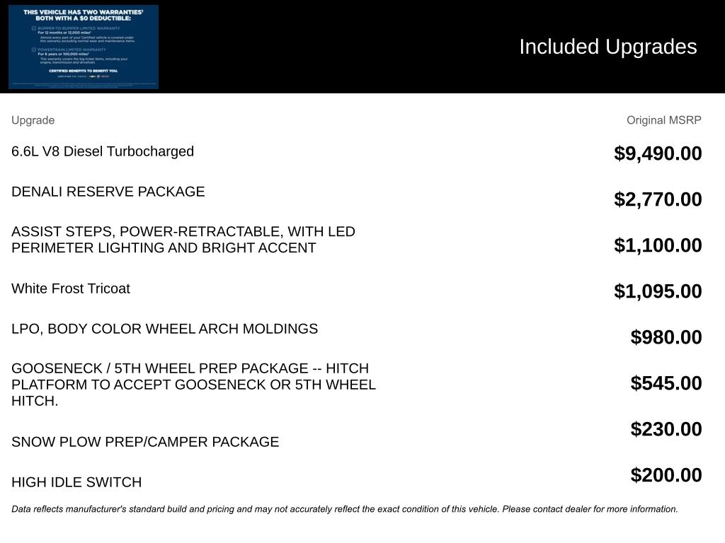 We look forward to serving you! Denali Reserve Package (Power Sunroof), Gooseneck/5th Wheel Prep Package, Preferred Equipment Group 5SA (120-Volt Bed Mounted Power Outlet, 120-Volt Instrument Panel Power Outlet, 2 Charge-Only Rear USB Ports, 2 Charge/Data USB Ports Inside Center Console, 2 USB Ports, 2-Speed Active Transfer Case, Bed View Camera w/2 Trailer Camera Provisions, Bose Premium 7-Speaker Sound System, Deep-Tinted Glass, Electric Rear-Window Defogger, Floor-Mounted Center Console, Front Rain-Sensing Wipers, GMC Connected Access Capable, HD Surround Vision, Heated 2nd Row Outboard Seats, Heated Driver & Front Outboard Passenger Seats, Integrated Trailer Brake Controller, Keyless Open & Start, LED Cargo Area Lighting, LED Smoked Amber Roof Marker Lamps, Manual Tilt-Wheel/Telescoping Steering Column, OnStar & GMC Connected Services Capable, Polished Exhaust Tip, Power Front Passenger Windows w/Express Up/Down, Power Sliding Rear Window w/Defogger, Push Button Start, Rear Cross Traffic Alert, Rear Wheelhouse Liners, Remote Vehicle Starter System, Safety Alert Seat, Signature Chrome Denali Grille, SiriusXM w/360L, Spray-On Bedliner w/Denali Logo, Steering Wheel Audio Controls, Trailer Cam Provisions & Trailer Viewing Software, Trailer Side Blind Zone Alert, Ultrasonic Front & Rear Park Assist, Unauthorized Entry Theft-Deterrent System, Universal Home Remote, Ventilated Driver & Front Passenger Seats, Wireless Charging, and Wireless Phone Projection), Snow Plow Prep/Camper Package (220-Amp Alternator), Technology Package (Adaptive Cruise Control, Inside Rearview Auto-Dimming Rear Camera Mirror, and Multicolor 15" Diagonal Head-Up Display), X31 Off-Road Package (Hill Descent Control), GMC Certified Pre-Owned Certified, 10-Speed Automatic, 4WD, Jet Black Leather, 12-Way Power Driver Seat Adjuster w/Lumbar, 12-Way Power Passenger Seat Adjuster w/Lumbar, 4-Wheel Disc Brakes, 7 Speakers, ABS brakes, Air Conditioning, Alloy wheels, AM/FM radio: SiriusXM with 360L, Apple CarPlay/Android Auto, Auto High-beam Headlights, Auto-dimming door mirrors, Auto-dimming Rear-View mirror, Automatic Emergency Braking, Automatic temperature control, Body Color Wheel Arch Moldings (LPO), Brake assist, Buckle to Drive, Bumpers: body-color, Compass, Delay-off headlights, Driver door bin, Driver Memory, Driver vanity mirror, Dual front impact airbags, Dual front side impact airbags, Electronic Stability Control, Emergency communication system: OnStar and GMC connected services capable, Engine Block Heater, Exhaust Brake, Following Distance Indicator, Forge Perforated Leather-Appointed Front Seat Trim, Forward Collision Alert, Front anti-roll bar, Front Bucket Seats, Front Center Armrest, Front dual zone A/C, Front fog lights, Front License Plate Kit, Front Pedestrian Braking, Front Prem Floor Liners w/Removable Carpet Insert, Front reading lights, Front wheel independent suspension, Fully automatic headlights, Garage door transmitter, Genuine wood dashboard insert, Genuine wood door panel inse