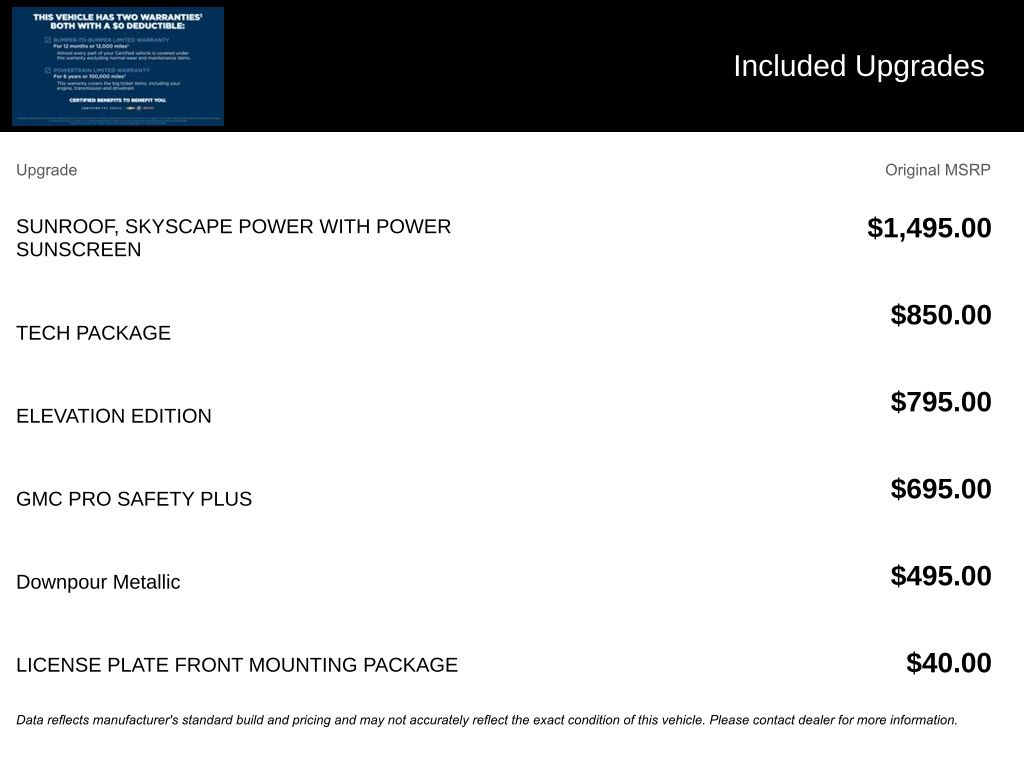 We look forward to serving you! Elevation Edition (Black GMC Center Caps w/Red GMC Lettering, Black Mirror Caps, Darkened Front Grille, Roof-Mounted Luggage Rack Side Rails, and Wheels: 19" Gloss Black Aluminum), GMC Pro Safety Plus (Adaptive Cruise Control, Lane Change Alert w/Side Blind Zone Alert, Rear Cross-Traffic Alert, Rear Park Assist, and Safety Alert Seat), License Plate Front Mounting Package, Preferred Equipment Group 4SA, Tech Package (Front & Rear Park Assist, HD Surround Vision, and Head-Up Display), AWD, 2 USB Data Ports, 2 USB Data Ports w/SD Card Reader, 3.47 Final Drive Axle Ratio, 4-Wheel Disc Brakes, 6 Speakers, 6-Speaker Audio System Feature, 6-Way Power Front Passenger Seat, 8-Way Power Driver Seat Adjuster, ABS brakes, Air Conditioning, Alloy wheels, AM/FM radio: SiriusXM, Auto High-beam Headlights, Auto-dimming Rear-View mirror, Automatic temperature control, Bluetooth® For Phone, Brake assist, Bumpers: body-color, Compass, Delay-off headlights, Driver & Front Passenger Heated Seats, Driver door bin, Driver vanity mirror, Dual front impact airbags, Dual front side impact airbags, Electronic Stability Control, Emergency communication system: OnStar and GMC connected services capable, Four wheel independent suspension, Front anti-roll bar, Front Bucket Seats, Front Center Armrest, Front dual zone A/C, Front fog lights, Front Passenger 2-Way Power Lumbar, Front reading lights, Fully automatic headlights, Garage door transmitter, Heated door mirrors, Heated front seats, Heated steering wheel, Illuminated entry, Low tire pressure warning, Memory seat, Occupant sensing airbag, Outside temperature display, Overhead airbag, Overhead console, Panic alarm, Passenger door bin, Passenger vanity mirror, Perforated Leather-Appointed Seat Trim, Power door mirrors, Power Driver Lumbar Control, Power driver seat, Power Liftgate, Power passenger seat, Power steering, Power windows, Radio data system, Radio: GMC Infotainment Audio System w/8" Display, Rear anti-roll bar, Rear seat center armrest, Rear window defroster, Rear window wiper, Remote keyless entry, Roof rack: rails only, Security system, SiriusXM, Skyscape Power Sunroof w/Power Sunscreen, Speed control, Speed-sensing steering, Split folding rear seat, Spoiler, Steering wheel mounted audio controls, Tachometer, Telescoping steering wheel, Tilt steering wheel, Traction control, Trip computer, Turn signal indicator mirrors, Variably intermittent wipers, Wheels: 18" x 7" Silver Painted Aluminum, and Wireless Apple CarPlay/Wireless Android AutO.