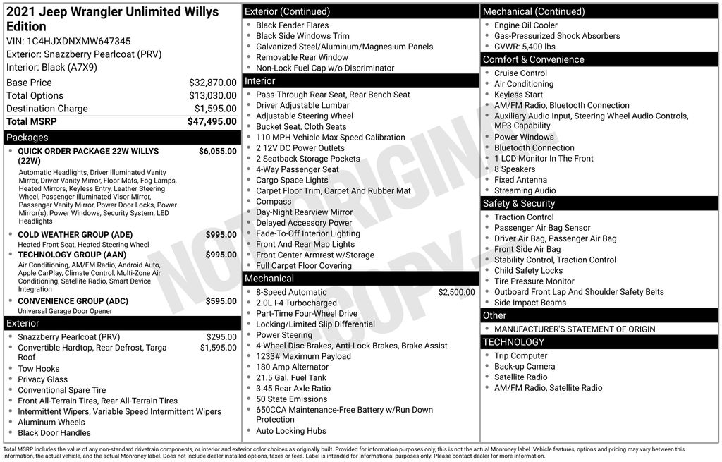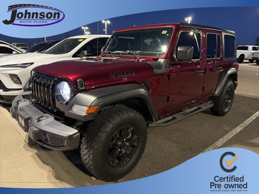 We look forward to serving you! Cold Weather Group (Heated Front Seats and Heated Steering Wheel), Convenience Group (Universal Garage Door Opener), LED Headlamp & Fog Lamp Group (Front LED Fog Lamps and LED Premium Reflector Headlamps), Quick Order Package 22W Willys (4-Wheel Drive Swing Gate Decal, Anti-Spin Differential Rear Axle, Automatic Headlamps, Black Grille, Black Trail Rated Badge, Deep Tint Sunscreen Windows, Front 1-Touch Down Power Windows, Leather Wrapped Steering Wheel, Matte Black Jeep Badge, Mold In Color Bumper w/Gloss Black, Power Heated Mirrors, Remote Keyless Entry, Security Alarm, Speed Sensitive Power Locks, Sun Visors w/Illuminated Vanity Mirrors, Wheels: 17" x 7.5" Moab Black Aluminum, Willys, Willys Hood Decal, and Wrangler Decal), Technology Group (7.0" Touchscreen Display, Air Conditioning w/Auto Temperature Control, Air Filtering, Apple CarPlay, Cluster 7.0" TFT Color Display, For More Info, Call 800-643-2112, Google Android Auto, GPS Antenna Input, Integrated Center Stack Radio, Radio: Uconnect 4 w/7" Display, SiriusXM Radio Service, SiriusXM Satellite Radio, and USB Host Flip), FCA US LLC Certified Pre-Owned Certified, 3.45 Rear Axle Ratio, 4-Wheel Disc Brakes, 8 Speakers, ABS brakes, Air Conditioning, AM/FM radio, Aux Battery, Black 3-Piece Hard Top, Brake assist, Cloth Low-Back Bucket Seats, Compass, Delay-off headlights, Driver door bin, Driver vanity mirror, Dual front impact airbags, Dual front side impact airbags, Electronic Stability Control, Freedom Panel Storage Bag, Front anti-roll bar, Front Bucket Seats, Front Center Armrest w/Storage, Front fog lights, Front reading lights, Integrated roll-over protection, Low tire pressure warning, Manufacturer's Statement of Origin, MOPAR All-Weather Floor Mats (DISC), No Soft Top, Non-Lock Fuel Cap w/o Discriminator, Normal Duty Suspension, Occupant sensing airbag, Outside temperature display, ParkView Rear Back-Up Camera, Passenger door bin, Passenger vanity mirror, Power steering, Radio data system, Radio: Uconnect 3 w/5" Display, Rear anti-roll bar, Rear reading lights, Rear Window Defroster, Rear Window Wiper/Washer, Speed control, Split folding rear seat, Steering wheel mounted audio controls, Stop-Start Dual Battery System, Tachometer, Telescoping steering wheel, Tilt steering wheel, Traction control, Trip computer, Variably intermittent wipers, and Wheels: 17" x 7.5" Black Steel StyleD.