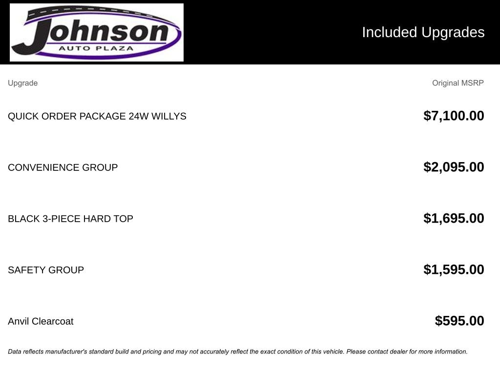 We look forward to serving you! Convenience Group (Corning Gorilla Glass, Daytime Running Lamp System, Emergency/Assistance Call, Front Door Locks 2-Door Passive Entry, Heated Front Seats, Heated Steering Wheel, Remote Start System, and Universal Garage Door Opener), Quick Order Package 24W Willys (4-Wheel Drive Decal, Advanced Brake Assist, Air Conditioning w/Auto Temperature Control, Automatic Headlamps, Auxiliary Switches, Black Grille, Body Color Fender Flares (2-Piece), Class IV Receiver Hitch, Cluster 7.0" TFT Color Display, Daytime Running Lamps LED Accents, Deep Tint Sunscreen Windows, E-Locker Rear Axle, Enhanced Adaptive Cruise Control, Front Heavy Duty Red Accent Shock Absorbers, Front LED Fog Lamps, Full Speed Forward Collision Warning Plus, Heavy-Duty Engine Cooling, LED Premium Reflector Headlamps, LED Taillamps, Mold In Color Bumper w/Gloss Black, MOPAR All-Weather Slush Mats, Off-Road Plus Mode, Power Heated Mirrors, Premium Wrapped Steering Wheel, Protection Sill Rails, Rear Heavy Duty Red Accent Shock Absorbers, Security Alarm, Sun Visors w/Illuminated Vanity Mirrors, Trailer Hitch Zoom, Wheels: 17" x 7.5" Painted Black, Willys Hood Decal, and Willys Suspension), Safety Group (Auto High Beam Headlamp Control, Blind Spot & Cross Path Detection, and ParkSense Rear Park Assist System), FCA US LLC Certified Pre-Owned Certified, 110 MPH Vehicle Max Speed Calibration, 12.3" Touchscreen Display, 3.73 Rear Axle Ratio, 4-Wheel Disc Brakes, 4G LTE Wi-Fi Hot Spot, 8 Speakers, ABS brakes, Air Conditioning, Alexa Built-In, AM/FM radio: SiriusXM, Apple CarPlay, Apple CarPlay/Android Auto, Black 3-Piece Hard Top, Brake assist, Cloth Low-Back Bucket Seats, Compass, Connectivity - US/Canada, Delay-off headlights, Driver door bin, Driver vanity mirror, Dual front impact airbags, Dual front side impact airbags, Electronic Stability Control, Freedom Panel Storage Bag, Front anti-roll bar, Front Bucket Seats, Front Center Armrest w/Storage, Front fog lights, Front License Plate Bracket, Front reading lights, Google Android Auto, Illuminated entry, Integrated roll-over protection, Low tire pressure warning, Normal Duty Suspension, Occupant sensing airbag, Outside temperature display, Overhead airbag, Panic alarm, ParkView Rear Back-Up Camera, Passenger door bin, Passenger vanity mirror, Power steering, Power windows, Radio data system, Radio: Uconnect 5 w/12.3" Display, Rear anti-roll bar, Rear reading lights, Rear Sliding Window, Rear Window Defroster, Remote keyless entry, Speed control, Split folding rear seat, Steering wheel mounted audio controls, Tachometer, Telescoping steering wheel, Tilt steering wheel, Traction control, Trip computer, USB Host Flip, Variably intermittent wipers, Voltmeter, and Wheels: 17" x 7.5" Black Steel StyleD.