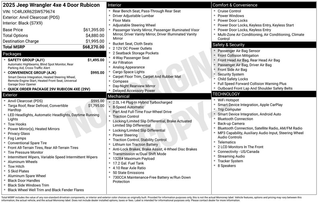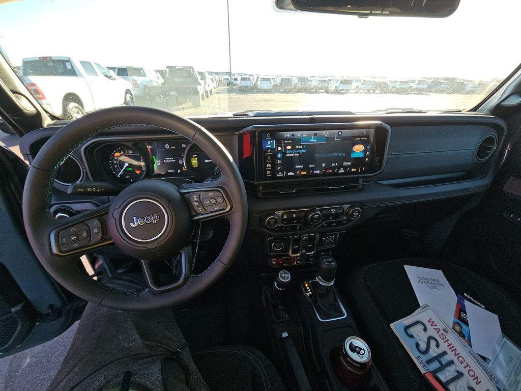 We look forward to serving you! Convenience Group (Heated Front Seats, Heated Steering Wheel, Remote Start System, and Universal Garage Door Opener), Quick Order Package 29V Rubicon 4xe, Safety Group (Auto High Beam Headlamp Control, Blind Spot & Cross Path Detection, and ParkSense Rear Park Assist System), 2.0L I4 DOHC, 4-Wheel Disc Brakes, 4.10 Rear Axle Ratio, 4G LTE Wi-Fi Hot Spot, 7 & 4 Pin Wiring Harness, 8 Speakers, ABS brakes, Air Conditioning, Alloy wheels, AM/FM radio: SiriusXM, Apple CarPlay, Apple CarPlay/Android Auto, Automatic temperature control, Black 3-Piece Hard Top, Brake assist, Compass, Connectivity - US/Canada, Delay-off headlights, Driver door bin, Driver vanity mirror, Dual front impact airbags, Dual front side impact airbags, Electronic Stability Control, Emergency communication system: Jeep Connect, Freedom Panel Storage Bag, Front anti-roll bar, Front Bucket Seats, Front Center Armrest w/Storage, Front dual zone A/C, Front fog lights, Front License Plate Bracket (DISC), Front reading lights, Fully automatic headlights, Google Android Auto, Heated door mirrors, Illuminated entry, Integrated roll-over protection, Integrated Voice Command w/Bluetooth, Low tire pressure warning, Occupant sensing airbag, Outside temperature display, Overhead airbag, Panic alarm, ParkView Rear Back-Up Camera, Passenger door bin, Passenger vanity mirror, Performance Suspension, Power door mirrors, Power steering, Power windows, Radio data system, Radio: Uconnect 5 w/12.3" Display, Rear anti-roll bar, Rear reading lights, Rear Window Defroster, Rear Window Wiper/Washer, Remote keyless entry, Security system, Speed control, Split folding rear seat, Steering wheel mounted audio controls, Sustainable Premium Cloth Seats, Tachometer, Telescoping steering wheel, Tilt steering wheel, Traction control, Trip computer, Variably intermittent wipers, Voltmeter, and Wheels: 17" x 7.5" Machined w/Black PocketS.