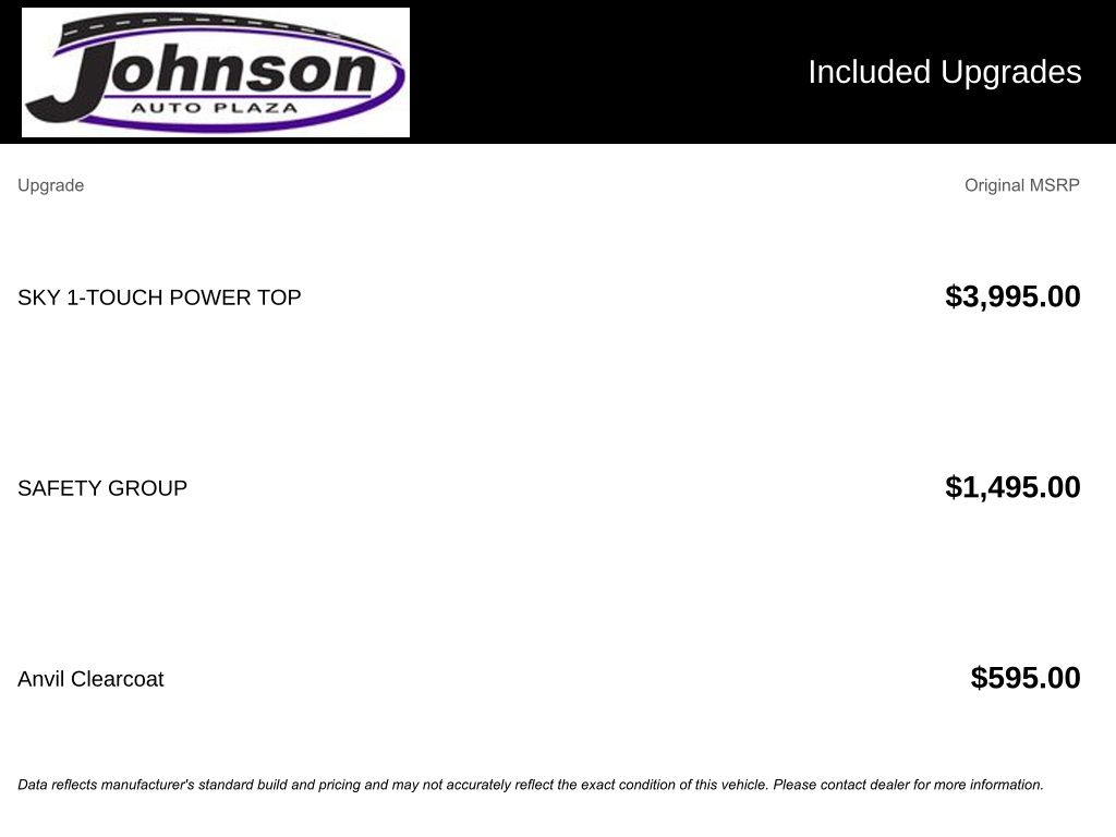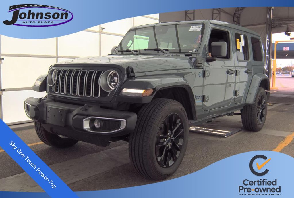 We look forward to serving you! Quick Order Package 29P Sahara 4xe, Safety Group (Auto High Beam Headlamp Control, Blind Spot & Cross Path Detection, and ParkSense Rear Park Assist System), 2.0L I4 DOHC, 3.73 Rear Axle Ratio, 4-Wheel Disc Brakes, 4G LTE Wi-Fi Hot Spot, 8 Speakers, ABS brakes, Air Conditioning, Alloy wheels, AM/FM radio: SiriusXM, Apple CarPlay, Apple CarPlay/Android Auto, Automatic temperature control, Brake assist, Cloth Low-Back Bucket Seats, Compass, Connectivity - US/Canada, Delay-off headlights, Driver door bin, Driver vanity mirror, Dual front impact airbags, Dual front side impact airbags, Electronic Stability Control, Emergency communication system: Jeep Connect, Front anti-roll bar, Front Bucket Seats, Front Center Armrest w/Storage, Front dual zone A/C, Front fog lights, Front License Plate Bracket (DISC), Front reading lights, Fully automatic headlights, Google Android Auto, Heated door mirrors, Heated front seats, Heated steering wheel, Illuminated entry, Integrated Center Stack Radio, Integrated roll-over protection, Integrated Voice Command w/Bluetooth, Low tire pressure warning, Occupant sensing airbag, Outside temperature display, Overhead airbag, Panic alarm, ParkView Rear Back-Up Camera, Passenger door bin, Passenger vanity mirror, Power door mirrors, Power steering, Power Top Quarter Window Storage Bag, Power windows, Radio data system, Radio: Uconnect 5 w/12.3" Display, Rear anti-roll bar, Rear reading lights, Rear seat center armrest, Rear Window Defroster, Rear Window Wiper/Washer, Remote keyless entry, Removable Rear Quarter Windows, Security system, Sky 1-Touch Power Top, Speed control, Split folding rear seat, Sport Suspension, Steering wheel mounted audio controls, Tachometer, Telescoping steering wheel, Tilt steering wheel, Traction control, Trip computer, Variably intermittent wipers, Voltmeter, and Wheels: 20" x 8" Painted Black AluminuM.