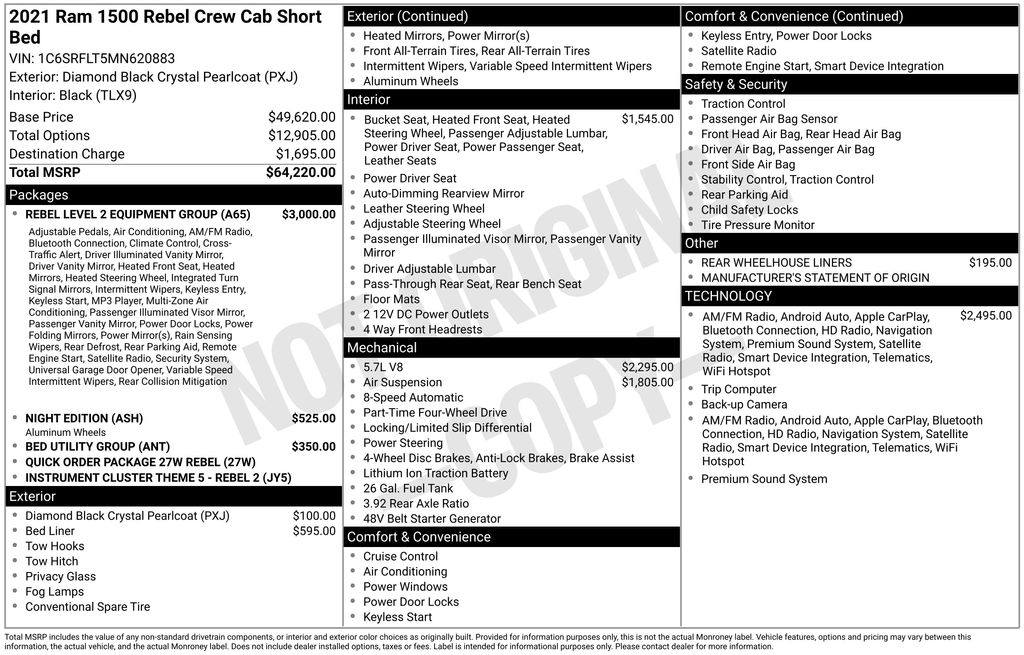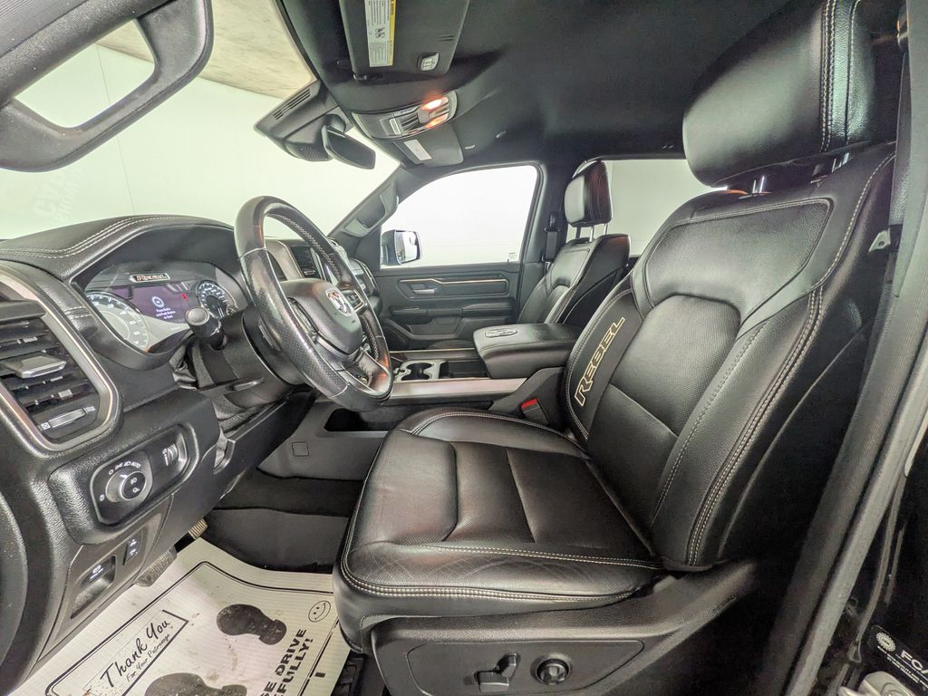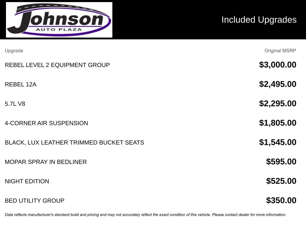 We look forward to serving you! Bed Utility Group (MOPAR Deployable Bed Step and Pick-Up Box Lighting), Night Edition (Black Front Bumper w/Black Plate and Wheels: 18" x 8.0" Gloss Black), Quick Order Package 27W Rebel, Rebel 12A (1-Yr SiriusXM Guardian Trial, 4 Way Front Headrests, 5-Year SiriusXM Travel Link Service, 9 Amplified Speakers w/Subwoofer, Apple CarPlay, Bucket Seats, Disassociated Touchscreen Display, For Details, Visit DriveUconnect.com, For More Info, Call 800-643-2112, Front Seat Back Map Pockets, Full Length Upgraded Floor Console, Google Android Auto, GPS Antenna Input, HD Radio, Heated Front Seats, Heated Steering Wheel, Integrated Voice Command w/Bluetooth, LED Footwell Lighting, Lux Leather Trimmed Bucket Seats, Power 4-Way Driver Lumbar Adjust, Power 8-Way Driver & Passenger Seats, Radio: Uconnect 12 w/Navigation, Rear 60/40 Folding Seat, SiriusXM Radio Service, SiriusXM Satellite Radio, SiriusXM Travel Link, and SiriusXM w/360L), Rebel Level 2 Equipment Group (Air Conditioning ATC w/Dual Zone Control, Auto-Dimming Exterior Driver Mirror, Body Color Door Handles, Foam Bottle Insert (Door Trim Panel), Media Hub w/2 Charge Only USBs, ParkSense Front/Rear Park Assist w/Stop, Power-Folding Mirrors, Rear Underseat Compartment Storage, Rear Window Defroster, and Universal Garage Door Opener), FCA US LLC Certified Pre-Owned Certified, 3.92 Rear Axle Ratio, 4-Corner Air Suspension, 4-Wheel Disc Brakes, 48V Belt Starter Generator, 6 Speakers, ABS brakes, Air Conditioning, Alloy wheels, AM/FM radio: SiriusXM, Auto-dimming Rear-View mirror, Black Exterior Mirrors, Brake assist, Cloth/Vinyl Low Back Bucket Seats, Compass, Delay-off headlights, Driver door bin, Dual front impact airbags, Dual front side impact airbags, Electronic Stability Control, Front anti-roll bar, Front Bucket Seats, Front Center Armrest w/Storage, Front fog lights, Front reading lights, Front wheel independent suspension, Fully automatic headlights, Heated door mirrors, Illuminated entry, Instrument Cluster Theme 5 - Rebel 2, Leather steering wheel, Low tire pressure warning, Manufacturer's Statement of Origin, MOPAR Spray In Bedliner, Occupant sensing airbag, Outside temperature display, Overhead airbag, Overhead console, Panic alarm, ParkView Rear Back-Up Camera, Passenger door bin, Passenger vanity mirror, Power door mirrors, Power driver seat, Power steering, Power windows, Radio data system, Radio: Uconnect 3 w/5" Display, Rear anti-roll bar, Rear seat center armrest, Rear step bumper, Rear Wheelhouse Liners, Remote keyless entry, Remote Start System, Speed control, Split folding rear seat, Steering wheel mounted audio controls, Tachometer, Telescoping steering wheel, Tilt steering wheel, Traction control, Trip computer, Variably intermittent wipers, Voltmeter, and Wheels: 18" x 8.0" Painted Mid-Gloss BlacK.