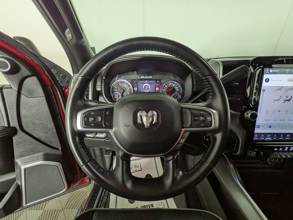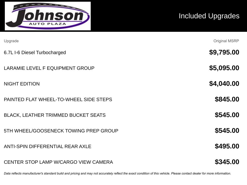 We look forward to serving you! Cold Weather Group (Engine Block Heater and MOPAR Winter Front Grille Cover), Laramie Level F Equipment Group (12" Touchscreen Display, 17 Speaker harman/kardon Premium Sound, 4G LTE Wi-Fi Hot Spot, Alexa Built-In, Apple CarPlay, Auto Adjust In Reverse Exterior Mirrors, Auto Dim Exterior Mirror, Auto High Beam Headlamp Control, Auto Power-Folding Mirrors, Auto-Dimming Exterior Passenger Mirror, Blind Spot & Cross Path Detection, Chrome Exterior Mirrors, Connected Travel & Traffic Services, Connectivity - US/Canada, Disassociated Touchscreen Display, Exterior Mirrors Courtesy Lamps, Exterior Mirrors w/Heating Element, Exterior Mirrors w/Memory, Exterior Mirrors w/Supplemental Signals, Foam Bottle Insert (Door Trim Panel), For Details, Visit DriveUconnect.com, For More Info, Call 800-643-2112, Forward & Reverse Utility Lights, Front LED Fog Lamps, Global Telematics Box Module (TBM), Google Android Auto, GPS Antenna Input, GPS Navigation, HD Radio, Heated Second Row Seats, Integrated Voice Command w/Bluetooth, LED Reflector Headlamps, Mirror Power Heat Fold Memory Tele, Mirror Running Lights, Off-Road Information Pages, ParkSense Front/Rear Park Assist System, Power Adjust Mirrors, Power Adjustable Convex Aux Mirrors, Power Adjustable Pedals w/Memory, Power Telescoping Mirrors, Radio: Uconnect 5 Nav w/12.0" Display, Radio/Driver Seat/Mirrors/Pedals Memory, Rain Sensitive Windshield Wipers, Rear Power Sliding Window, Rear Window Defroster, Remote Tailgate Release, Selectable Tire Fill Alert, SiriusXM Radio Service, SiriusXM w/360L, and Trailer Tow Pages), Night Edition (Black Exterior Truck Badging, Black Headlamp Bezels, Black Interior Accents, Black RAM Head Tailgate Badge, Black Tail Lamp Bezels, Black Wheel Center Hub, Body Color Grille Surround, Gloss Black Grille Billets/Accents, Sport Performance Hood, and Wheels: 20" x 8.0" Black Painted Aluminum), Quick Order Package 2HH Laramie, FCA US LLC Certified Pre-Owned Certified, 10 Speakers, 115V Auxiliary Rear Power Outlet, 2 Way Rear Headrest Seat, 220 Amp Alternator, 3.73 Axle Ratio, 4 Way Front Headrests, 4-Wheel Disc Brakes, 5th Wheel/Gooseneck Towing Prep Group, ABS brakes, Active Noise Control System, Air Conditioning, Alloy wheels, AM/FM radio: SiriusXM with 360L, Anti-Spin Differential Rear Axle, Apple CarPlay/Android Auto, Auto-dimming Rear-View mirror, Automatic temperature control, Brake assist, Bumpers: body-color, Center Hub, Center Stop Lamp w/Cargo View Camera, Clearance Lamps, Compass, Delay-off headlights, Driver door bin, Driver vanity mirror, Dual front impact airbags, Dual front side impact airbags, Electronic Stability Control, Electronically Controlled Throttle, Front anti-roll bar, Front Center Armrest w/Storage, Front dual zone A/C, Front License Plate Bracket, Front reading lights, Front Seat Back Map Pockets, Fully automatic headlights, Garage door transmitter, Heated door mirrors, Heated F