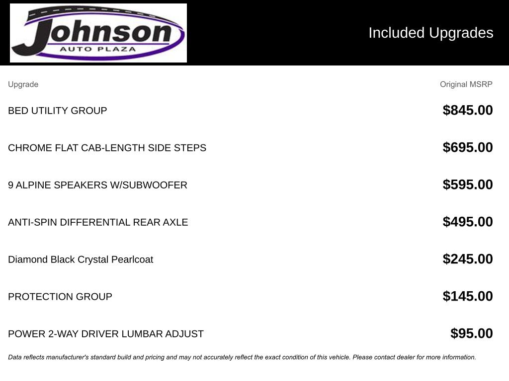 We look forward to serving you! Bed Utility Group (LED Bed Lighting, MOPAR Deployable Bed Step, and MOPAR Spray In Bedliner), Level 1 Equipment Group (2 Way Rear Headrest Seat, 2nd Row In Floor Storage Bins, 4 Way Front Headrests, 40/20/40 Split Bench Seat, 4G LTE Wi-Fi Hot Spot, 8.4" Touchscreen Display, Apple CarPlay, Auto Power-Folding Mirrors, Big Horn IP Badge, Black Exterior Mirrors, Bluetooth Handsfree Phone & Audio, Center Hub, Connectivity - US/Canada, Dual Glove Boxes, Exterior Mirrors Courtesy Lamps, Exterior Mirrors w/Heating Element, Exterior Mirrors w/Supplemental Signals, Foam Bottle Insert (Door Trim Panel), Footwell Courtesy Lamp, For Details, Visit DriveUconnect.com, For More Info, Call 800-643-2112, Forward & Reverse Utility Lights, Front Armrest w/Cupholders, Front Center Seat Cushion Storage, Front Fog Lamps, Front Seat Back Map Pockets, Global Telematics Box Module (TBM), Glove Box Lamp, Google Android Auto, GPS Antenna Input, Integrated Center Stack Radio, Integrated Voice Command w/Bluetooth, Leather Wrapped Steering Wheel, Locking Lower Glove Box, Manual Adjust 4-Way Front Passenger Seat, Mirror Running Lights, Power 2-Way Driver Lumbar Adjust, Power Adjust 8-Way Driver Seat, Power Adjust Mirrors, Power Adjustable Convex Aux Mirrors, Power Heated Fold Telescope Mirrors, Power Telescoping Mirrors, Rear 60/40 Folding Seat, Rear Dome w/On/Off Switch Lamp, Remote USB Port - Charge Only, Selectable Tire Fill Alert, SiriusXM Radio Service, SiriusXM Satellite Radio, Steering Wheel Mounted Audio Controls, Storage Tray, and Wheels: 18" x 8.0" Polished Aluminum), Protection Group (Tow Hooks), Quick Order Package 2GZ Big Horn, FCA US LLC Certified Pre-Owned Certified, 3.73 Axle Ratio, 4-Wheel Disc Brakes, 6 Speakers, 9 Alpine Speakers w/Subwoofer, ABS brakes, Active Noise Control System, Air Conditioning, Anti-Spin Differential Rear Axle, Brake assist, Bumpers: chrome, Center Stack Storage Drawer, Chrome Flat Cab-Length Side Steps, Cloth 40/20/40 Bench Seat, Compass, Delay-off headlights, Driver door bin, Dual front impact airbags, Dual front side impact airbags, Electronic Stability Control, Electronically Controlled Throttle, Emergency communication system: SiriusXM Guardian, Front anti-roll bar, Front Center Armrest w/Storage, Front License Plate Bracket, Front reading lights, Fully automatic headlights, Heated door mirrors, Illuminated entry, Low tire pressure warning, Manual Adjust 4-Way Driver Seat, Manufacturer's Statement of Origin, Occupant sensing airbag, Outside temperature display, Overhead airbag, Overhead console, Panic alarm, ParkView Rear Back-Up Camera, Passenger door bin, Passenger vanity mirror, Power door mirrors, Power steering, Power windows, Premium Cloth 40/20/40 Bench Seat (DISC), Radio data system, Radio: Uconnect 3 w/5" Display, Radio: Uconnect 5 W w/8.4" Display, Rear anti-roll bar, Rear Folding Seat, Rear seat center armrest, Rear step bumper, Remote keyless entry,