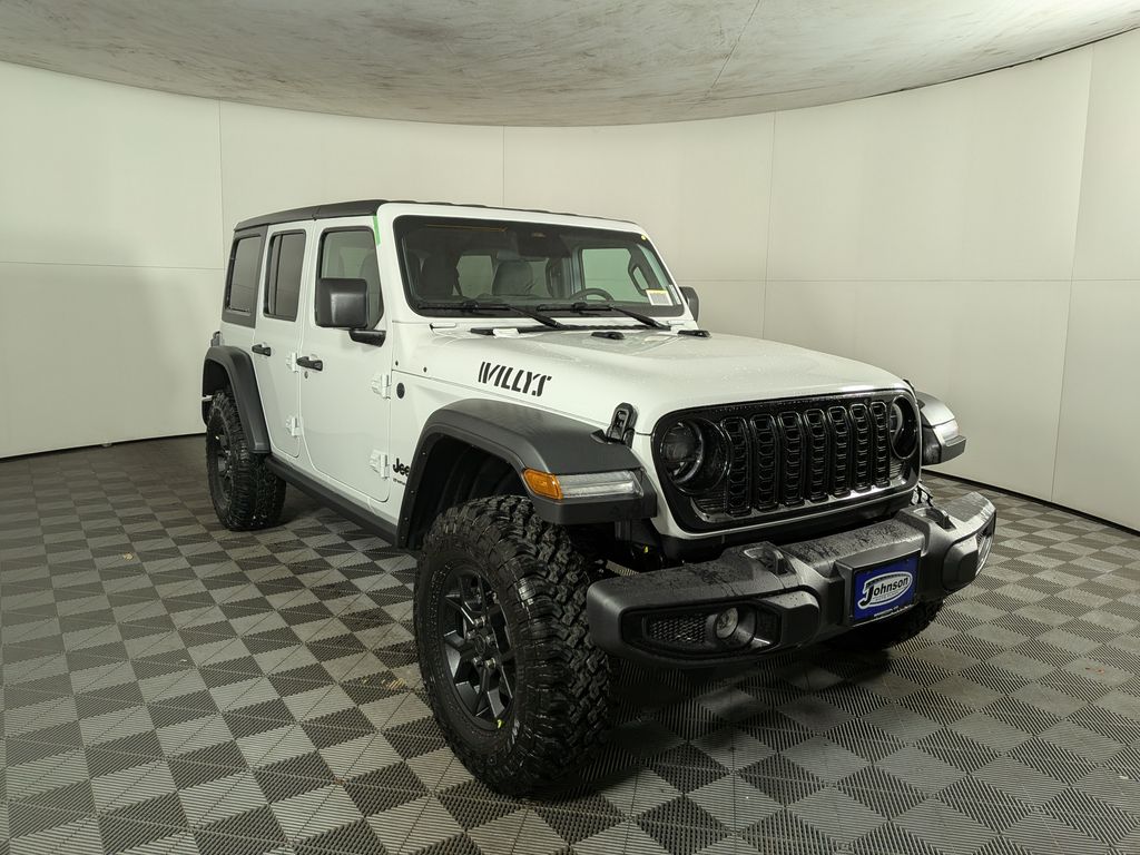 We look forward to serving you! Convenience Group (2-Door Passive Entry, Front Door Locks, Air Conditioning w/Auto Temperature Control, Air Filtering, Cluster 7.0" TFT Color Display, Emergency/Assistance Call, Heated Front Seats, Heated Steering Wheel, Remote Start System, and Universal Garage Door Opener), Quick Order Package 24W Willys (4-Wheel Drive Swing Gate Decal, 7 & 4 Pin Wiring Harness, Advanced Brake Assist, Automatic Headlamps, Auxiliary Switches, Black Grille, Class II Receiver Hitch, Conventional Differential Front Axle, Corning Gorilla Glass, Dana M210 Wide HD Tube Front Axle, Dana M220 Wide Rear Axle, Daytime Running Lamps LED Accents, Deep Tint Sunscreen Windows, E-Locker Rear Axle, Enhanced Adaptive Cruise Control, Front LED Fog Lamps, Full Speed Forward Collision Warning Plus, Injection Molded Black Rear Bumper, LED Premium Reflector Headlamps, Mold In Color Bumper w/Gloss Black, Molded in Color Rubicon Highline Flare, MOPAR All-Weather Floor Mats, Off-Road Plus Mode, Power Heated Mirrors, Premium Wrapped Steering Wheel, Security Alarm, Sun Visors w/Illuminated Vanity Mirrors, Wheels: 17" x 7.5" Painted Black, Willy's Suspension, and Willys Hood Decal), Safety Group (Auto High Beam Headlamp Control, Blind Spot & Cross Path Detection, LED Taillamps, and ParkSense Rear Park Assist System), Trailer Tow & Aux Switch Group, 4-Wheel Disc Brakes, 8 Speakers, ABS brakes, Air Conditioning, AM/FM radio: SiriusXM with 360L, Apple CarPlay/Android Auto, Aux Battery, Black 3-Piece Hard Top, Brake assist, Cloth Low-Back Bucket Seats, Compass, Delay-off headlights, Driver door bin, Driver vanity mirror, Dual front impact airbags, Dual front side impact airbags, Electronic Stability Control, Freedom Panel Storage Bag, Front anti-roll bar, Front Bucket Seats, Front Center Armrest w/Storage, Front fog lights, Front reading lights, Illuminated entry, Integrated roll-over protection, Low tire pressure warning, Non-Lock Fuel Cap w/o Discriminator, Normal Duty Suspension, Occupant sensing airbag, Outside temperature display, Overhead airbag, Panic alarm, ParkView Rear Back-Up Camera, Passenger door bin, Passenger vanity mirror, Power steering, Power windows, Radio data system, Radio: Uconnect 5 w/12.3" Display, Rear anti-roll bar, Rear reading lights, Rear Window Defroster, Rear Window Wiper/Washer, Remote keyless entry, Speed control, Split folding rear seat, Steering wheel mounted audio controls, Stop-Start Dual Battery System, Tachometer, Telescoping steering wheel, Tilt steering wheel, Traction control, Trip computer, Variably intermittent wipers, and Wheels: 17" x 7.5" Black Steel StyleD. All customers may not qualify for all rebates. Price includes: $1500 - 2026 National Retail Bonus Cash . Exp. 12/01/2025 $1500 - 2026 National Stellantis Loyalty Retail Bonus Cash . Exp. 12/01/2025