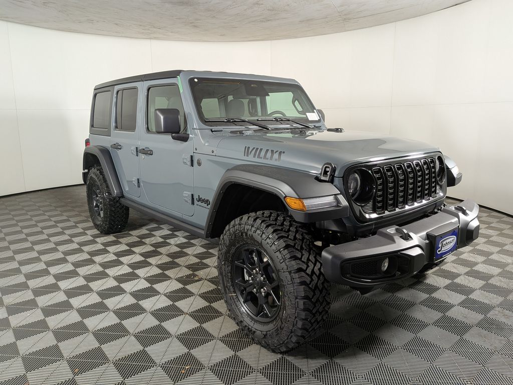 We look forward to serving you! Convenience Group (2-Door Passive Entry, Front Door Locks, Air Conditioning w/Auto Temperature Control, Air Filtering, Cluster 7.0" TFT Color Display, Emergency/Assistance Call, Heated Front Seats, Heated Steering Wheel, Remote Start System, and Universal Garage Door Opener), Quick Order Package 22W Willys (4-Wheel Drive Swing Gate Decal, 7 & 4 Pin Wiring Harness, Advanced Brake Assist, Automatic Headlamps, Auxiliary Switches, Black Grille, Class II Receiver Hitch, Conventional Differential Front Axle, Corning Gorilla Glass, Dana M210 Wide HD Tube Front Axle, Dana M220 Wide Rear Axle, Daytime Running Lamps LED Accents, Deep Tint Sunscreen Windows, E-Locker Rear Axle, Enhanced Adaptive Cruise Control, Front LED Fog Lamps, Full Speed Forward Collision Warning Plus, Injection Molded Black Rear Bumper, LED Premium Reflector Headlamps, Mold In Color Bumper w/Gloss Black, Molded in Color Rubicon Highline Flare, MOPAR All-Weather Floor Mats, Off-Road Plus Mode, Power Heated Mirrors, Premium Wrapped Steering Wheel, Security Alarm, Sun Visors w/Illuminated Vanity Mirrors, Wheels: 17" x 7.5" Painted Black, Willy's Suspension, and Willys Hood Decal), 4-Wheel Disc Brakes, 8 Speakers, ABS brakes, Air Conditioning, AM/FM radio: SiriusXM with 360L, Apple CarPlay/Android Auto, Aux Battery, Black 3-Piece Hard Top, Brake assist, Cloth Low-Back Bucket Seats, Compass, Delay-off headlights, Driver door bin, Driver vanity mirror, Dual front impact airbags, Dual front side impact airbags, Electronic Stability Control, Engine Oil Cooler, Freedom Panel Storage Bag, Front anti-roll bar, Front Bucket Seats, Front Center Armrest w/Storage, Front fog lights, Front reading lights, Illuminated entry, Integrated roll-over protection, Low tire pressure warning, Non-Lock Fuel Cap w/o Discriminator, Normal Duty Suspension, Occupant sensing airbag, Outside temperature display, Overhead airbag, Panic alarm, ParkView Rear Back-Up Camera, Passenger door bin, Passenger vanity mirror, Power steering, Power windows, Radio data system, Radio: Uconnect 5 w/12.3" Display, Rear anti-roll bar, Rear reading lights, Rear Window Defroster, Rear Window Wiper/Washer, Remote keyless entry, Speed control, Split folding rear seat, Steering wheel mounted audio controls, Stop-Start Dual Battery System, Tachometer, Telescoping steering wheel, Tilt steering wheel, Traction control, Trip computer, Variably intermittent wipers, and Wheels: 17" x 7.5" Black Steel StyleD. All customers may not qualify for all rebates. Price includes: $1500 - 2026 National Retail Bonus Cash . Exp. 12/01/2025 $1500 - 2026 National Stellantis Loyalty Retail Bonus Cash . Exp. 12/01/2025