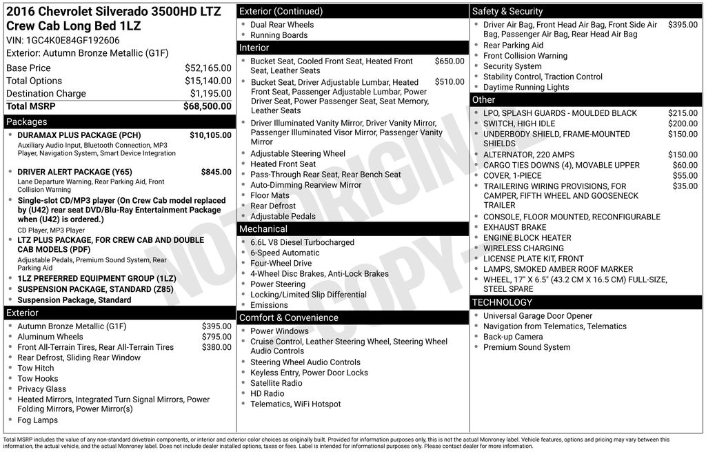 We look forward to serving you! Driver Alert Package (Forward Collision Alert and Lane Departure Warning System), Duramax Plus Package (Engine Block Heater, HD Radio, and Radio: Chevrolet MyLink w/Navigation), LTZ Plus Package (Power Adjustable Pedals), Preferred Equipment Group 1LZ (110-Volt AC Power Outlet, 150 Amps Alternator, 4.2" Diagonal Color Display Driver Info Center, 6-Speaker Audio System, Auto-Dimming Inside Rear-View Mirror, Chrome Bodyside Moldings, Chrome Door Handles, Chrome Power-Adjustable Heated Outside Mirrors, Color-Keyed Carpeting Floor Covering, Deep-Tinted Glass, Digital Steering Assist, Driver & Front Passenger Visors, Dual-Zone Automatic Climate Control, Electric Rear-Window Defogger, Electronic Shift Transfer Case, EZ-Lift & Lower Tailgate, Front Halogen Fog Lamps, Leather-Wrapped Steering Wheel, Manual Tilt-Wheel/Telescoping Steering Column, OnStar Guidance Plan For 6 Months, OnStar w/4G LTE, Power Sliding Rear Window w/Defogger, Power Windows, Rear 60/40 Folding Bench Seat (Folds Up), Rear Vision Camera w/Dynamic Guide Lines, Remote Keyless Entry, Remote Locking Tailgate, Remote Vehicle Starter System, Single-Slot CD/MP3 Player, SiriusXM Satellite Radio, Steering Wheel Audio Controls, Unauthorized Entry Theft-Deterrent System, and Universal Home Remote), Standard Suspension Package, Trailering Equipment, Allison 1000 6-Speed Automatic, 4WD, Cocoa/Dune Leather, 1-Piece Radiator Grille & Fr Bumper Opening Cover, 220 Amp Alternator, 4 Movable Upper Cargo Tie Downs, 4-Wheel Disc Brakes, 6 Speakers, ABS brakes, Air Conditioning, AM/FM radio: SiriusXM, Auto-dimming Rear-View mirror, Automatic temperature control, Black Molded Splash Guards (LPO), Bodyside moldings, Bose 6 Speaker Sound System, Brake assist, Bumpers: chrome, CD player, Compass, Delay-off headlights, Driver door bin, Driver vanity mirror, Dual front impact airbags, Electronic Stability Control, Emergency communication system, Exhaust Brake, Exterior Parking Camera Rear, Floor Mounted Console, Front 40/20/40 Split Bench Seat, Front anti-roll bar, Front Center Armrest w/Storage, Front dual zone A/C, Front fog lights, Front Full Feature Bucket Seats, Front License Plate Kit, Front reading lights, Front wheel independent suspension, Fully automatic headlights, Garage door transmitter, Heated & Vented Front Seating, Heated door mirrors, Heated Driver & Front Passenger Seats, Heated front seats, High Idle Switch, Illuminated entry, Integrated Trailer Brake Controller, Leather-Appointed Seat Trim, Memory seat, Occupant sensing airbag, Outside temperature display, Overhead console, Panic alarm, Passenger door bin, Passenger vanity mirror, Power door mirrors, Power driver seat, Power passenger seat, Power steering, Power windows, Premium audio system: Chevrolet MyLink, Radio: Chevrolet MyLink Audio System, Rear reading lights, Rear seat center armrest, Rear step bumper, Rear window defroster, Remote keyless entry, Security system, Single-Stage Driver & Front Passenger Air Bags, Speed control, Speed-sensing steering, Split folding rear seat, Steering wheel mounted audio controls, Tachometer, Telescoping steering wheel, Tilt steering wheel, Traction control, Trip computer, Turn signal indicator mirrors, Ultrasonic Front & Rear Park Assist, Variably intermittent wipers, Voltmeter, and Wireless CharginG.