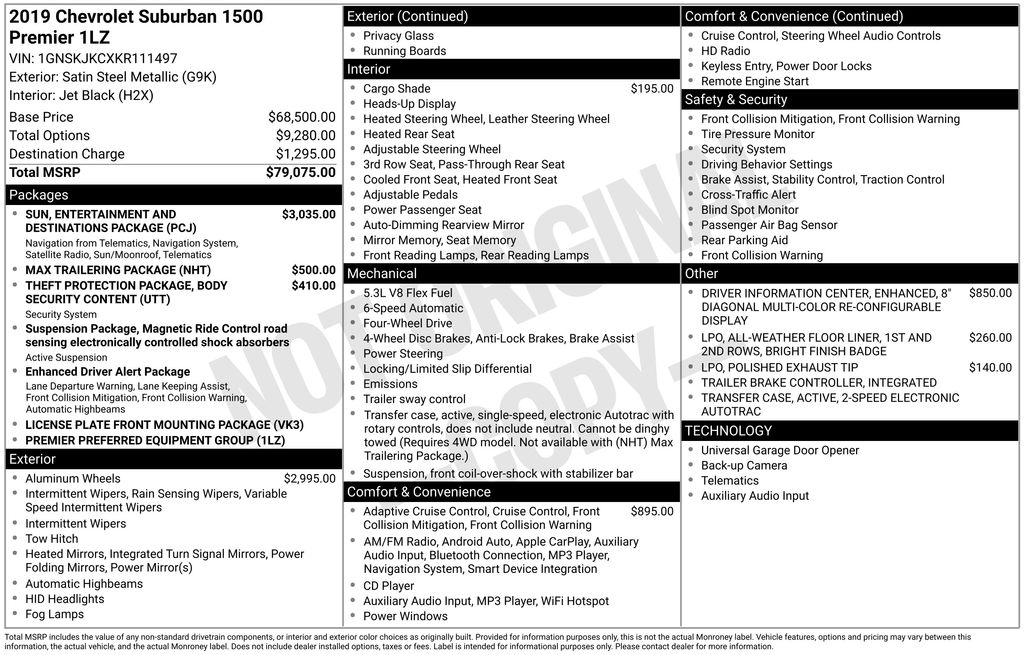 We look forward to serving you! Body Security Content Theft-Protection Package (Theft-Deterrent Alarm System, Vehicle Inclination Sensor, and Vehicle Interior Movement Sensor), Enhanced Driver Alert Package (Forward Collision Alert, IntelliBeam w/Automatic High Beam On/Off, Lane Keep Assist w/Lane Departure Warning, Low Speed Forward Automatic Braking, and Safety Alert Seat), License Plate Front Mounting Package, Magnetic Ride Control Suspension Package, Max Trailering Package (2-Speed Active Electronic AutoTrac Transfer Case and Integrated Trailer Brake Controller), Preferred Equipment Group 1LZ (12-Volt Auxiliary Power Outlet (5), 1st & 2nd Row Color-Keyed Carpeted Floor Mats, 3rd Row 60/40 Power Fold Split-Bench, 4-Wheel Antilock Disc Brakes, 6-Way Power Front Passenger Seat Adjuster, Auto-Dimming Inside Rear-View Mirror, Black Assist Steps, Color-Keyed Carpeting Floor Covering, Driver Inboard & Front Passenger Airbags, Electronic Cruise Control w/Set & Resume Speed, Floor Console w/Storage Area, Fog Lamps, Front & Rear Park Assist, Hands-Free Power Liftgate, HD Radio, Heated 2nd Row Outboard Seats, Heated Leather Wrapped Steering Wheel, Lane Change Alert w/Side Blind Zone Alert, Memory Settings, Passive Entry System, Power Folding & Adjustable Heated Outside Mirrors, Power Release 2nd Row Bucket Seats, Power Tilt & Telescoping Steering Column, Power-Adjustable Accelerator & Brake Pedals, Push Button Keyless Start, Rear Cross Traffic Alert, Remote Vehicle Start, Roof-Mounted Luggage Rack Side Rails, SiriusXM Radio, Universal Home Remote, and Wireless Charging), Sun, Entertainment & Destinations Package (3rd Row DVD Screen, Power Tilt-Sliding Sunroof w/Express-Open/Close, and Rear Seat Entertainment System), 10 Speakers, 1st & 2nd Rows All-Weather Floor Liner (LPO), 3rd row seats: split-bench, 4-Wheel Disc & 4-Wheel VAC Power Antilock Brakes, 4-Wheel Disc Brakes, ABS brakes, Adaptive suspension, Adjustable pedals, Advanced Adaptive Cruise Control, Air Conditioning, Alloy wheels, AM/FM radio: SiriusXM, AM/FM Stereo w/Navigation, Apple CarPlay/Android Auto, Auto High-beam Headlights, Auto-dimming door mirrors, Auto-dimming Rear-View mirror, Automatic temperature control, Bodyside moldings, Bose Centerpoint Premium 10-Speaker Surround Sound, Brake assist, Bumpers: body-color, Cargo Security Shade (LPO), CD player, Compass, Delay-off headlights, Driver door bin, Driver vanity mirror, Dual front impact airbags, Dual front side impact airbags, Electronic Stability Control, Emergency communication system: OnStar and Chevrolet connected services capable, Enhanced Driver Information Center, Exterior Parking Camera Rear, Forward Automatic Braking, Front anti-roll bar, Front Bucket Seats, Front Center Armrest, Front dual zone A/C, Front fog lights, Front reading lights, Front wheel independent suspension, Fully automatic headlights, Garage door transmitter, Head-Up Display, Headphones, Heated & Ventilated Driver & Front Passenger Seats, Heated & Ventilated Front Reclining Bucket Seats, Heated door mirrors, Heated front seats, Heated rear seats, Heated steering wheel, High-Intensity Discharge Headlights, Illuminated entry, Leather Shift Knob, Low tire pressure warning, Memory seat, Navigation System, Occupant sensing airbag, Outside temperature display, Overhead airbag, Overhead console, Panic alarm, Passenger door bin, Passenger vanity mirror, Pedal memory, Perforated Leather-Appointed Seat Trim, Polished Exhaust Tip, Power door mirrors, Power driver seat, Power Liftgate, Power passenger seat, Power steering, Power windows, Rain sensing wipers, Rear air conditioning, Rear