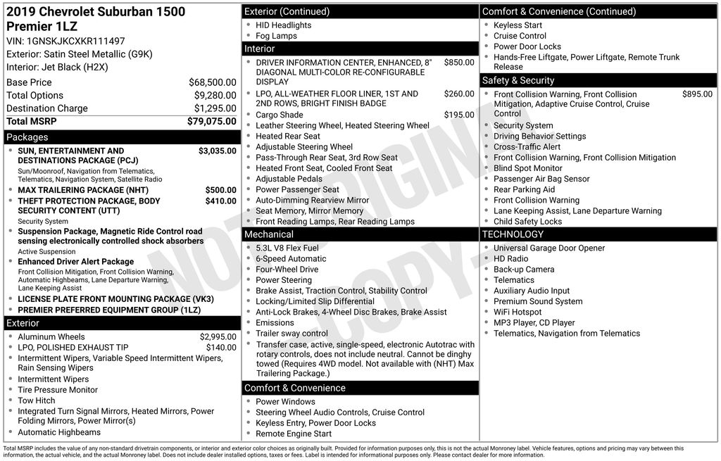 We look forward to serving you! Body Security Content Theft-Protection Package (Theft-Deterrent Alarm System, Vehicle Inclination Sensor, and Vehicle Interior Movement Sensor), Enhanced Driver Alert Package (Forward Collision Alert, IntelliBeam w/Automatic High Beam On/Off, Lane Keep Assist w/Lane Departure Warning, Low Speed Forward Automatic Braking, and Safety Alert Seat), License Plate Front Mounting Package, Magnetic Ride Control Suspension Package, Max Trailering Package (2-Speed Active Electronic AutoTrac Transfer Case and Integrated Trailer Brake Controller), Preferred Equipment Group 1LZ (12-Volt Auxiliary Power Outlet (5), 1st & 2nd Row Color-Keyed Carpeted Floor Mats, 3rd Row 60/40 Power Fold Split-Bench, 4-Wheel Antilock Disc Brakes, 6-Way Power Front Passenger Seat Adjuster, Auto-Dimming Inside Rear-View Mirror, Black Assist Steps, Color-Keyed Carpeting Floor Covering, Driver Inboard & Front Passenger Airbags, Electronic Cruise Control w/Set & Resume Speed, Floor Console w/Storage Area, Fog Lamps, Front & Rear Park Assist, Hands-Free Power Liftgate, HD Radio, Heated 2nd Row Outboard Seats, Heated Leather Wrapped Steering Wheel, Lane Change Alert w/Side Blind Zone Alert, Memory Settings, Passive Entry System, Power Folding & Adjustable Heated Outside Mirrors, Power Release 2nd Row Bucket Seats, Power Tilt & Telescoping Steering Column, Power-Adjustable Accelerator & Brake Pedals, Push Button Keyless Start, Rear Cross Traffic Alert, Remote Vehicle Start, Roof-Mounted Luggage Rack Side Rails, SiriusXM Radio, Universal Home Remote, and Wireless Charging), Sun, Entertainment & Destinations Package (3rd Row DVD Screen, Power Tilt-Sliding Sunroof w/Express-Open/Close, and Rear Seat Entertainment System), 10 Speakers, 1st & 2nd Rows All-Weather Floor Liner (LPO), 3rd row seats: split-bench, 4-Wheel Disc & 4-Wheel VAC Power Antilock Brakes, 4-Wheel Disc Brakes, ABS brakes, Adaptive suspension, Adjustable pedals, Advanced Adaptive Cruise Control, Air Conditioning, Alloy wheels, AM/FM radio: SiriusXM, AM/FM Stereo w/Navigation, Apple CarPlay/Android Auto, Auto High-beam Headlights, Auto-dimming door mirrors, Auto-dimming Rear-View mirror, Automatic temperature control, Bodyside moldings, Bose Centerpoint Premium 10-Speaker Surround Sound, Brake assist, Bumpers: body-color, Cargo Security Shade (LPO), CD player, Compass, Delay-off headlights, Driver door bin, Driver vanity mirror, Dual front impact airbags, Dual front side impact airbags, Electronic Stability Control, Emergency communication system: OnStar and Chevrolet connected services capable, Enhanced Driver Information Center, Exterior Parking Camera Rear, Forward Automatic Braking, Front anti-roll bar, Front Bucket Seats, Front Center Armrest, Front dual zone A/C, Front fog lights, Front reading lights, Front wheel independent suspension, Fully automatic headlights, Garage door transmitter, Head-Up Display, Headphones, Heated & Ventilated Driver & Front Passenger Seats, Heated & Ventilated Front Reclining Bucket Seats, Heated door mirrors, Heated front seats, Heated rear seats, Heated steering wheel, High-Intensity Discharge Headlights, Illuminated entry, Leather Shift Knob, Low tire pressure warning, Memory seat, Navigation System, Occupant sensing airbag, Outside temperature display, Overhead airbag, Overhead console, Panic alarm, Passenger door bin, Passenger vanity mirror, Pedal memory, Perforated Leather-Appointed Seat Trim, Polished Exhaust Tip, Power door mirrors, Power driver seat, Power Liftgate, Power passenger seat, Power steering, Power windows, Rain sensing wipers, Rear air conditioning, Rear anti-roll bar, Rear audio controls, Rear reading li