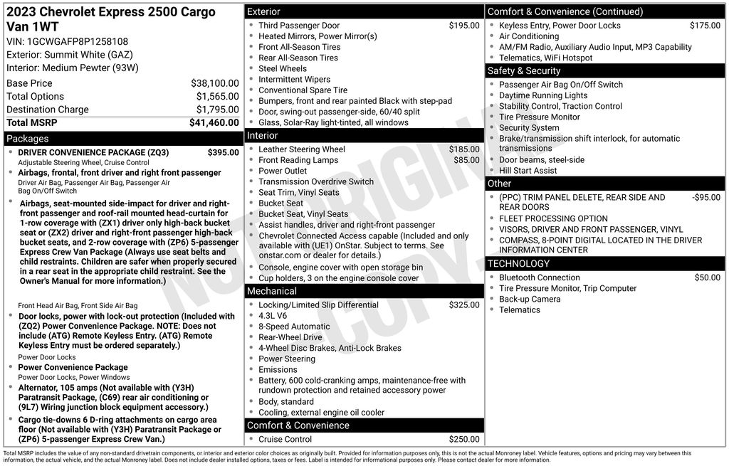 We look forward to serving you! Driver Convenience Package (Cruise Control and Tilt Steering Wheel), Preferred Equipment Group 1WT, 16" x 6.5" Steel Wheels, 2 Speakers, 3.42 Rear Axle Ratio, 4-Wheel Disc Brakes, 8-Point Digital Compass, ABS brakes, Air Conditioning, AM/FM radio, AM/FM Stereo w/MP3 Player, Auxiliary Lighting, Bluetooth® For Phone, Delay-off headlights, Driver & Front Passenger High-Back Bucket Seats, Driver & Front Passenger Vinyl Visors, Driver door bin, Driver's Seat Mounted Armrest, Dual front impact airbags, Dual front side impact airbags, Electronic Stability Control, Emergency communication system: OnStar and Chevrolet connected services capable, Exterior Parking Camera Rear, Front anti-roll bar, Front Bucket Seats, Front Reclining High-Back Bucket Seats, Front wheel independent suspension, Full-Length Black Rubberized-Vinyl Floor Covering, Fully automatic headlights, Heated door mirrors, Heavy-Duty Rear Locking Differential, Leather-Wrapped Steering Wheel, Low tire pressure warning, Occupant sensing airbag, Overhead airbag, Passenger cancellable airbag, Passenger door bin, Passenger seat mounted armrest, Power door mirrors, Power steering, Power windows, Reading Lights, Remote Keyless Entry, Seat-Mounted & Roof-Rail Side-Impact Airbags, Single-Zone Manual Air Conditioning, Sliding Passenger-Side Door, Steering Wheel Mounted Audio Controls, Tachometer, Theft Alarm Notification, Traction control, Trip computer, Underhood Lights, Variably intermittent wipers, Vinyl Seat Trim, and VoltmeteR.