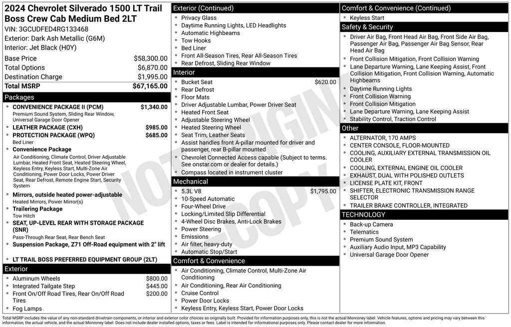 We look forward to serving you! Convenience Package (10-Way Power Driver Seat w/Lumbar, 120-Volt Bed Mounted Power Outlet, 120-Volt Interior Power Outlet, Dual Rear USB Ports (Charge Only), Dual-Zone Automatic Climate Control, Electric Rear-Window Defogger, Heated Driver & Front Outboard Passenger Seats, Heated Steering Wheel, Keyless Open & Start, Remote Vehicle Starter System, Theft Deterrent System (Unauthorized Entry), and Wrapped Steering Wheel), Convenience Package II (Hitch Guidance w/Hitch View, In-Vehicle Trailering System App, Integrated Trailer Brake Controller, Power Sliding Rear Window w/Rear Defogger, Premium Bose 7-Speaker Sound System, and Universal Home Remote), Leather Package (Leather-Appointed Front Seat Trim), Preferred Equipment Group 2LT (12.3" Multicolor Reconfigurable Digital Display, 6-Speaker Audio System, All-Weather Floor Liner (LPO) (AAK), Auto-Locking Rear Differential, Bluetooth® For Phone, Chevrolet Connected Access Capable, Color-Keyed Carpeting Floor Covering, Deep-Tinted Glass, Electrical Steering Column Lock, Electronic Cruise Control, EZ Lift Power Lock & Release Tailgate, Front LED Fog Lamps, HD Rear Vision Camera, Heated Power-Adjustable Outside Mirrors, High Gloss Black Mirror Caps, Inside Rear-View Mirror w/Tilt, LED Cargo Area Lighting, OnStar & Chevrolet Connected Services Capable, Performance Red Recovery Hooks, Power Front Windows w/Driver Express Up/Down, Power Front Windows w/Passenger Express Down, Power Rear Windows w/Express Down, Rear 60/40 Folding Bench Seat (Folds Up), SiriusXM w/360L, Standard Tailgate, Steering Wheel Audio Controls, and Wi-Fi Hot Spot Capable), Protection Package (Chevytec Spray-On Black Bedliner and Rear Wheelhouse Liners), Suspension Package (Heavy-Duty Air Filter and Hill Descent Control), Trailering Package (Hitch Guidance), Up-Level Rear Seat w/Storage Package, 10-Speed Automatic, 4WD, Black Leather, 170 Amp Alternator, 2 USB Data Ports, 220 Amp Alternator, 3.23 Rear Axle Ratio, 3.42 Rear Axle Ratio, 4-Wheel Disc Brakes, 40/20/40 Front Split-Bench Seat, 6 Speakers, ABS brakes, Air Conditioning, Alloy wheels, AM/FM radio: SiriusXM with 360L, Auto High-beam Headlights, Automatic Emergency Braking, Automatic temperature control, Auxiliary External Transmission Oil Cooler, Brake assist, Cloth Seat Trim, Compass, Delay-off headlights, Driver door bin, Driver vanity mirror, Dual Exhaust w/Polished Outlets, Dual front impact airbags, Dual front side impact airbags, Electronic Stability Control, Electronic Transmission Range Selector Shifter, External Engine Oil Cooler, Floor Mounted Center Console, Following Distance Indicator, Forward Collision Alert, Front anti-roll bar, Front Bucket Seats, Front Center Armrest w/Storage, Front dual zone A/C, Front fog lights, Front License Plate Kit, Front Pedestrian Braking, Front reading lights, Front wheel independent suspension, Fully automatic headlights, Heated door mirrors, Heated front seats, Heated steering wheel, Illuminated entry, IntelliBeam Automatic High Beam On/Off, Lane Keep Assist w/Lane Departure Warning, Low tire pressure warning, Multi-Flex Tailgate, Occupant sensing airbag, Outside temperature display, Overhead airbag, Overhead console, Panic alarm, Passenger door bin, Passenger vanity mirror, Power door mirrors, Power driver seat, Power steering, Power windows, Premium audio system: Chevrolet Infotainment 3 Premium, Radio data system, Radio: Chevrolet Infotainment 3 Premium System, Rear reading lights, Rear step bumper, Rear window defroster, Remote keyless entry, Security system, Single Outlet Exhaust, Speed control, Speed-sensing steering, Split fol