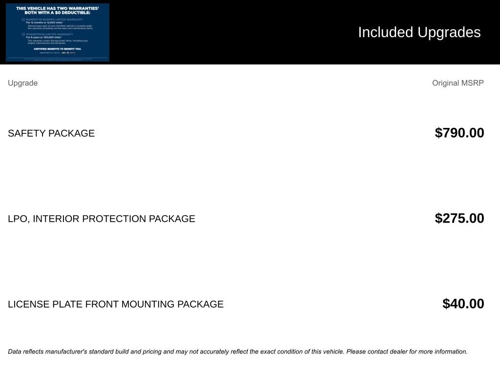 * 24 months/24,000 miles (whichever comes first) Certified Pre-Owned Scheduled Maintenance Plan and 3 days/150 miles (whichever comes first) Vehicle Exchange Program. SiriusXM 3-month trial subscription.
