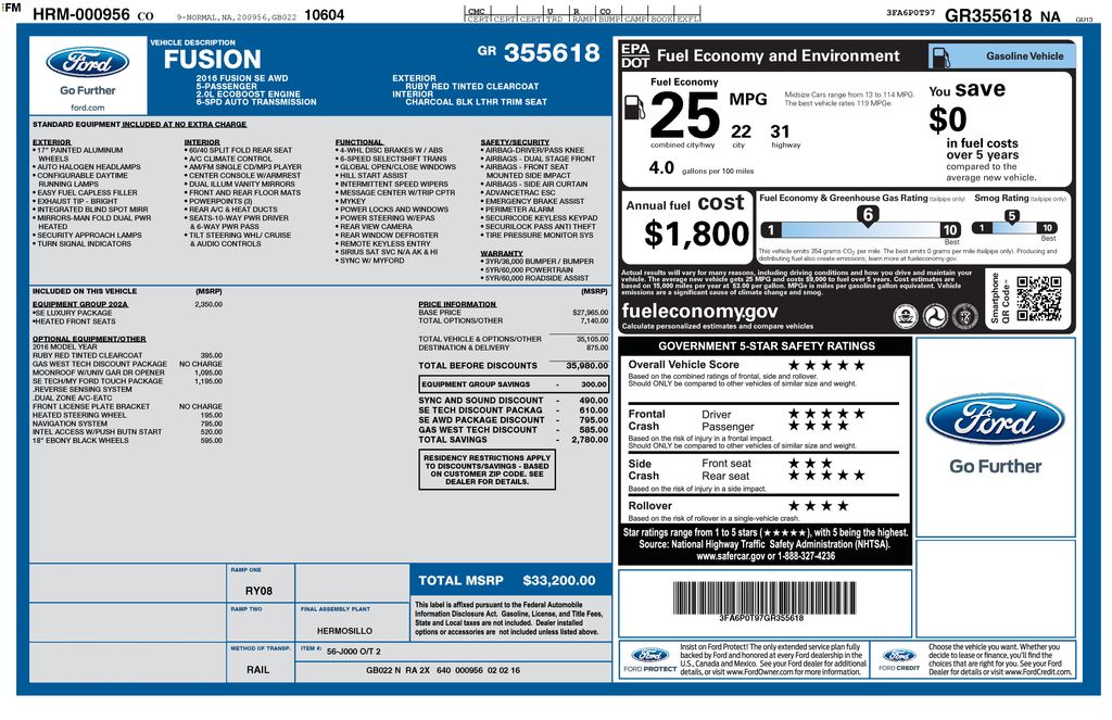 2016 Ford Fusion SE Ruby Red Metallic AWD EcoBoost 2.0L I4 GTDi DOHC Turbocharged VCT 6-Speed Automatic