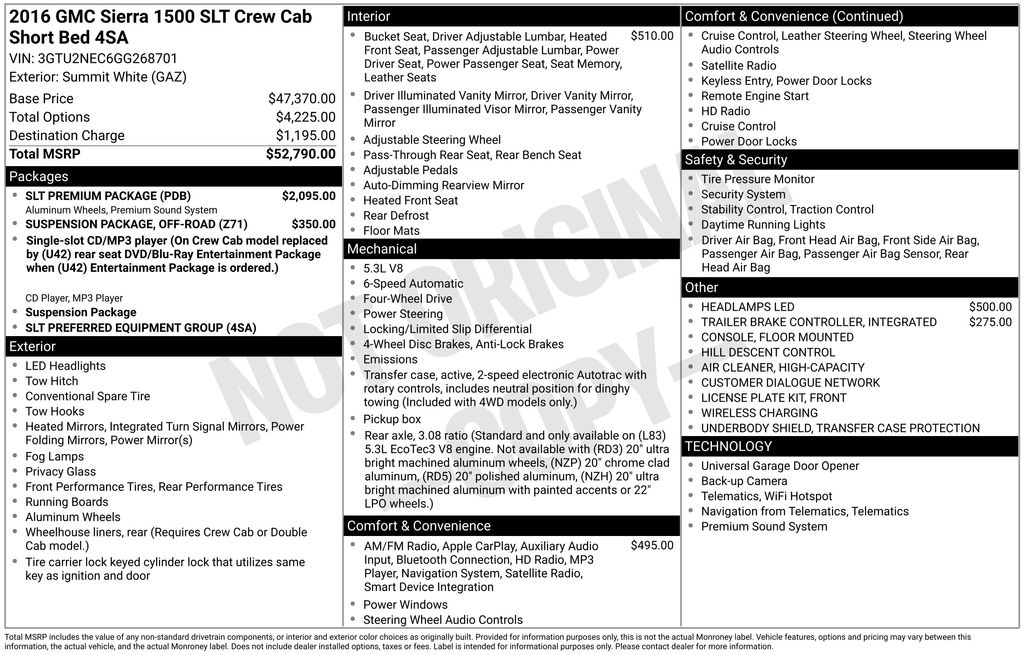 We look forward to serving you! Off-Road Suspension Package (Hill Descent Control), Preferred Equipment Group 4SA (110-Volt AC Power Outlet, 150 Amp Alternator, 2-Speed Active Electronic AutoTrac Transfer Case, 4.2" Diagonal Color Display Driver Info Center, Auto-Dimming Inside Rear-View Mirror, Auxiliary External Transmission Oil Cooler, Chrome Bodyside Moldings, Chrome Door Handles, Chrome Mirror Caps, Color-Keyed Carpeting w/Rubberized Vinyl Floor Mats, Deep-Tinted Glass, Driver & Front Passenger Illuminated Vanity Mirrors, Dual-Zone Automatic Climate Control, Electric Rear-Window Defogger, EZ Lift & Lower Tailgate, Front Frame-Mounted Black Recovery Hooks, Heavy-Duty Rear Locking Differential, Leather Wrapped Steering Wheel w/Cruise Controls, LED Cargo Box Lighting, LED Tailamps w/Signature, Manual Tilt/Telescoping Steering Column, OnStar 6 Month Guidance Plan, OnStar w/4G LTE, Power Adjustable Pedals, Power Folding & Adjustable Heated Outside Mirrors, Power Windows w/Driver Express Up & Down, Rear 60/40 Folding Bench Seat (Folds Up), Rear Vision Camera w/Dynamic Guide Lines, Rear Wheelhouse Liners, Remote Keyless Entry, Remote Vehicle Starter System, Single Slot CD/MP3 Player, Steering Wheel Audio Controls, Theft Deterrent System (Unauthorized Entry), Thin Profile LED Front Fog Lamps, and Universal Home Remote), SLT Premium Package (6" Rectangular Chromed Tubular Assist Steps and Bose Speaker System), Trailering Equipment, 6-Speed Automatic Electronic with Overdrive, 4WD, Black Leather, 10-Way Power Driver's Seat Adjuster, 20" x 9" Polished Aluminum Wheels, 4-Wheel Disc Brakes, 40/20/40 Front Split Bench Seat, 6 Speakers, 6-Speaker Audio System, ABS brakes, Adjustable pedals, Air Conditioning, Alloy wheels, AM/FM radio: SiriusXM, Auto-dimming door mirrors, Auto-dimming Rear-View mirror, Automatic temperature control, Bodyside moldings, Brake assist, Bumpers: chrome, CD player, Compass, Delay-off headlights, Driver door bin, Driver vanity mirror, Dual front impact airbags, Dual front side impact airbags, Electronic Stability Control, Emergency communication system: OnStar Guidance, Exterior Parking Camera Rear, Floor Mounted Console, Front anti-roll bar, Front Center Armrest w/Storage, Front dual zone A/C, Front fog lights, Front Full Feature Power Reclining Bucket Seats, Front License Plate Kit, Front reading lights, Front wheel independent suspension, Fully automatic headlights, Garage door transmitter: HomeLink, HD Radio, Heated door mirrors, Heated Driver & Front Passenger Seats, Heated front seats, Heavy Duty Suspension, High-Performance LED Headlamps, Illuminated entry, Integrated Trailer Brake Controller, Leather Appointed Seat Trim, Low tire pressure warning, Memory seat, Occupant sensing airbag, Outside temperature display, Overhead airbag, Overhead console, Panic alarm, Passenger door bin, Passenger vanity mirror, Power door mirrors, Power driver seat, Power passenger seat, Power steering, Power windows, Premium audio system: IntelliLink, Radio data system, Radio: AM/FM Stereo w/8" Diagonal Color Touch Nav., Radio: AM/FM Stereo w/8" Diagonal Color Touch Screen, Rear reading lights, Rear seat center armrest, Rear step bumper, Rear window defroster, Remote keyless entry, Security system, SiriusXM Satellite Radio, Speed control, Speed-sensing steering, Split folding rear seat, Steering wheel mounted audio controls, Tachometer, Telescoping steering wheel, Tilt steering wheel, Traction control, Trip computer, Turn signal indicator mirrors, Variably intermittent wipers, Voltmeter, Wheels: 18" x 8.5" Polished Aluminum, and Wireless CharginG.