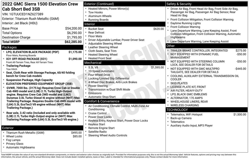 We look forward to serving you! Cloth Rear Seat w/Storage Package, Elevation Black Package (LPO) (6" Rectangular Black Tubular Assist Steps (LPO), All-Weather Floor Liner (LPO), and Black GMC Emblems (LPO)), High Capacity Suspension Package, Preferred Equipment Group 3SB (120-Volt Bed Mounted Power Outlet, 120-Volt Instrument Panel Power Outlet, 2 Charge/Data USB Ports, 2 Type-C Charge-Only Rear USB Ports, 6-Speaker Audio System Feature, Auto-Locking Rear Differential, Body Color Header w/Gloss Black Mesh Grille Bars, Color-Keyed Carpeting Floor Covering, Compass, Deep-Tinted Glass, Electric Rear-Window Defogger, Electrical Steering Column Lock, Front Frame-Mounted Black Recovery Hooks, Front Rubberized-Vinyl Floor Mats, GMC Connected Access Capable, HD Rear Vision Camera, Heated Steering Wheel, Keyless Open & Start, LED Cargo Area Lighting, Manual Tilt-Wheel & Telescoping Steering Column, OnStar & GMC Connected Services Capable, Power Door Locks, Power Front Windows w/Driver Express Up/Down, Power Front Windows w/Passenger Express Down, Power Rear Windows w/Express Down, Push Button Start, Rear Rubberized-Vinyl Floor Mats, Remote Vehicle Starter System, SiriusXM w/360L, Steering Wheel Audio Controls, Theft Deterrent System (Unauthorized Entry), Wi-Fi Hotspot Capable, and Wireless Phone Projection), Trailering Package (Hitch Guidance), X31 Off-Road Package (Dual Exhaust System, Heavy-Duty Air Filter, Hill Descent Control, Off-Road Suspension, Rear Wheelhouse Liners, and X31 Hard Badge), 10-Speed Automatic, 4WD, Black Cloth, 10-Way Power Driver Seat Adjuster w/Lumbar, 170 Amp Alternator, 2 Charge/Data USB Ports Inside Center Console, 220 Amp Alternator, 3 Years of OnStar & Connected Services Plan, 4-Way Manual Passenger Seat Adjuster, 4-Wheel Disc Brakes, 6 Speakers, ABS brakes, Air Conditioning, Alloy wheels, AM/FM radio: SiriusXM with 360L, Apple CarPlay/Android Auto, Auto High-beam Headlights, Automatic Emergency Braking, Automatic temperature control, Auxiliary External Transmission Oil Cooler, Brake assist, Buckle to Drive, Bumpers: body-color, Cloth Seat Trim, Delay-off headlights, Driver door bin, Driver vanity mirror, Dual front impact airbags, Dual front side impact airbags, Electronic Precision Shift, Electronic Stability Control, Emergency communication system: OnStar and GMC Connected Services capable, Exterior Parking Camera Rear, External Engine Oil Cooling, Floor-Mounted Center Console, Following Distance Indicator, Forward Collision Alert, Front 40/20/40 Split-Bench Seat, Front anti-roll bar, Front Bucket Seats, Front Center Armrest w/Storage, Front dual zone A/C, Front fog lights, Front License Plate Kit, Front Pedestrian Braking, Front reading lights, Front wheel independent suspension, Fully automatic headlights, Heated door mirrors, Heated Driver & Front Outboard Passenger Seating, Heated front seats, Heated steering wheel, Illuminated entry, Integrated Trailer Brake Controller, IntelliBeam Automatic High Beam On/Off, Lane Keep Assist w/Lane Departure Warning, Low tire pressure warning, Navigation System, Not Equipped w/Dynamic Fuel Management, Not Equipped w/Steering Column Lock, Not Equipped with GMC MultiPro Tailgate, Occupant sensing airbag, Outside temperature display, Overhead airbag, Overhead console, Panic alarm, Passenger door bin, Passenger vanity mirror, Power door mirrors, Power driver seat, Power steering, Power windows, Premium audio system: GMC Infotainment System, Radio data system, Radio: Premium GMC Infotainment Audio System, Rear reading lights, Rear seat center armrest, Rear step bumper, Rear window defroster, Remote keyless entry, Security system, Sp