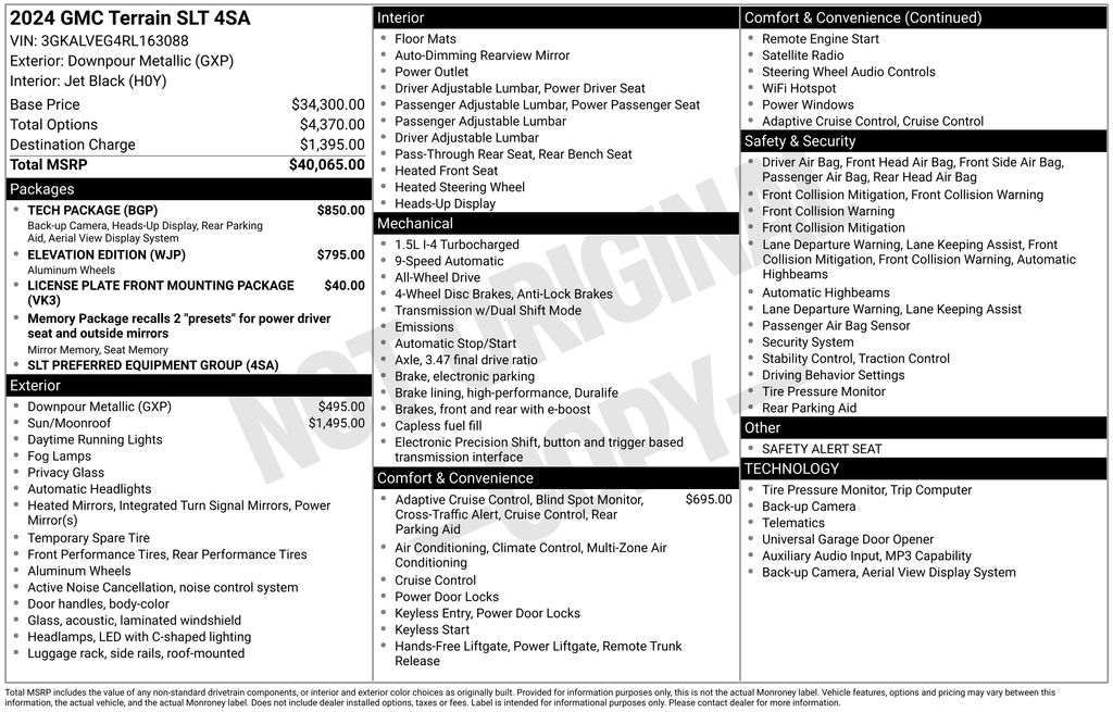 We look forward to serving you! Elevation Edition (Black GMC Center Caps w/Red GMC Lettering, Black Mirror Caps, Darkened Front Grille, Roof-Mounted Luggage Rack Side Rails, and Wheels: 19" Gloss Black Aluminum), GMC Pro Safety Plus (Adaptive Cruise Control, Lane Change Alert w/Side Blind Zone Alert, Rear Cross-Traffic Alert, Rear Park Assist, and Safety Alert Seat), License Plate Front Mounting Package, Preferred Equipment Group 4SA, Tech Package (Front & Rear Park Assist, HD Surround Vision, and Head-Up Display), AWD, 2 USB Data Ports, 2 USB Data Ports w/SD Card Reader, 3.47 Final Drive Axle Ratio, 4-Wheel Disc Brakes, 6 Speakers, 6-Speaker Audio System Feature, 6-Way Power Front Passenger Seat, 8-Way Power Driver Seat Adjuster, ABS brakes, Air Conditioning, Alloy wheels, AM/FM radio: SiriusXM, Auto High-beam Headlights, Auto-dimming Rear-View mirror, Automatic temperature control, Bluetooth® For Phone, Brake assist, Bumpers: body-color, Compass, Delay-off headlights, Driver & Front Passenger Heated Seats, Driver door bin, Driver vanity mirror, Dual front impact airbags, Dual front side impact airbags, Electronic Stability Control, Emergency communication system: OnStar and GMC connected services capable, Four wheel independent suspension, Front anti-roll bar, Front Bucket Seats, Front Center Armrest, Front dual zone A/C, Front fog lights, Front Passenger 2-Way Power Lumbar, Front reading lights, Fully automatic headlights, Garage door transmitter, Heated door mirrors, Heated front seats, Heated steering wheel, Illuminated entry, Low tire pressure warning, Memory seat, Occupant sensing airbag, Outside temperature display, Overhead airbag, Overhead console, Panic alarm, Passenger door bin, Passenger vanity mirror, Perforated Leather-Appointed Seat Trim, Power door mirrors, Power Driver Lumbar Control, Power driver seat, Power Liftgate, Power passenger seat, Power steering, Power windows, Radio data system, Radio: GMC Infotainment Audio System w/8" Display, Rear anti-roll bar, Rear seat center armrest, Rear window defroster, Rear window wiper, Remote keyless entry, Roof rack: rails only, Security system, SiriusXM, Skyscape Power Sunroof w/Power Sunscreen, Speed control, Speed-sensing steering, Split folding rear seat, Spoiler, Steering wheel mounted audio controls, Tachometer, Telescoping steering wheel, Tilt steering wheel, Traction control, Trip computer, Turn signal indicator mirrors, Variably intermittent wipers, Wheels: 18" x 7" Silver Painted Aluminum, and Wireless Apple CarPlay/Wireless Android AutO.