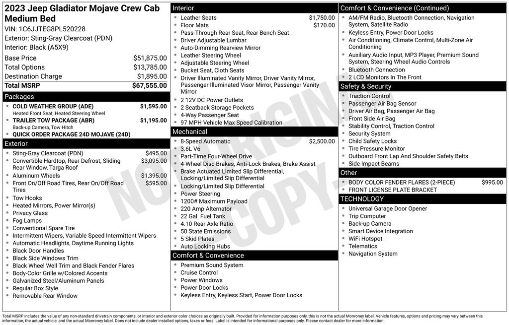 We look forward to serving you! Cold Weather Group (Heated Front Seats and Heated Steering Wheel), Quick Order Package 24D Mojave, Trailer Tow Package (240 Amp Alternator, Class IV Receiver Hitch, Heavy-Duty Engine Cooling, and Trailer Hitch Zoom), 4-Wheel Disc Brakes, 4.10 Rear Axle Ratio, 9 Speakers, 97 MPH Vehicle Max Speed Calibration, ABS brakes, Air Conditioning, Alloy wheels, AM/FM radio: SiriusXM, Apple CarPlay/Android Auto, Auto-dimming Rear-View mirror, Automatic temperature control, Body Color 3-Piece Hard Top, Body Color Fender Flares (2-Piece), Brake assist, Compass, Delay-off headlights, Driver door bin, Driver vanity mirror, Dual front impact airbags, Dual front side impact airbags, Electronic Stability Control, Emergency communication system, Freedom Panel Storage Bag, Front anti-roll bar, Front Bucket Seats, Front Center Armrest w/Storage, Front dual zone A/C, Front fog lights, Front License Plate Bracket, Front reading lights, Fully automatic headlights, Garage door transmitter, Heated door mirrors, Heavy Duty Suspension w/Gas Shocks, Illuminated entry, Integrated roll-over protection, Leather steering wheel, Low tire pressure warning, MOPAR All-Weather Slush Mats, MOPAR Black Stitched Leather Upgrade, Navigation System, No Soft Top, Occupant sensing airbag, Outside temperature display, Panic alarm, ParkView Rear Back-Up Camera, Passenger door bin, Passenger vanity mirror, Power door mirrors, Power steering, Power windows, Premium Cloth Seats w/Sport Bolsters, Radio data system, Radio: Uconnect 4C Nav w/8.4" Display, Rear anti-roll bar, Rear reading lights, Rear Sliding Window, Rear Window Defroster, Remote keyless entry, Security system, Speed control, Split folding rear seat, Steering wheel mounted audio controls, Tachometer, Telescoping steering wheel, Tilt steering wheel, Traction control, Trip computer, Variably intermittent wipers, Voltmeter, Wheels: 17" x 7.5" Low Gloss Black Aluminum, and Wheels: 17" x 7.5" Low Gloss Black MachineD.