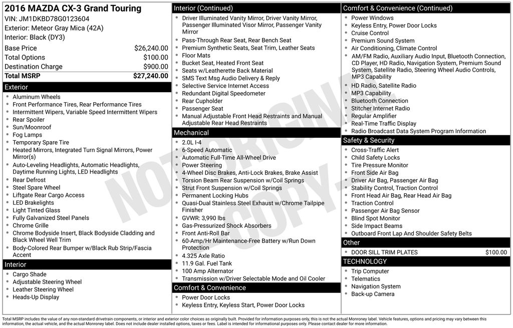 2016 Mazda CX-3 Grand Touring Meteor Gray Mica AWD SKYACTIV®-G 2.0L 4-Cylinder DOHC 16V 6-Speed Automatic
