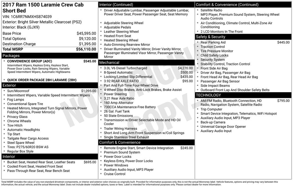 We look forward to serving you! Convenience Group (Auto High Beam Headlamp Control, Keyless Enter-N-Go, Rain Sensitive Windshield Wipers, and Remote Proximity Keyless Entry), Quick Order Package 28H Laramie, 1 Yr. Trial (Registration Required), 10 Speakers, 115V Auxiliary Power Outlet, 20" x 9" Chrome Clad Aluminum Wheels, 4-Wheel Disc Brakes, 5-Year SiriusXM Traffic Service, 5-Year SiriusXM Travel Link Service, 8.4" Touchscreen Display, ABS brakes, Active Grille Shutters, Adjustable pedals, Air Conditioning, Alloy wheels, AM/FM radio, Anti-Spin Differential Rear Axle, Audio Jack Input for Mobile Devices, Audio memory, Auto-dimming door mirrors, Auto-dimming Rear-View mirror, Automatic temperature control, Body Color Fender Flares, Brake assist, Bright Rotary Shifter, Bumpers: chrome, Center Hub, Compass, Delay-off headlights, Driver door bin, Driver vanity mirror, Dual front impact airbags, Dual front side impact airbags, Electronic Shift, Electronic Stability Control, Emergency communication system: Uconnect Access, Folding Flat Load Floor Storage, Front anti-roll bar, Front Center Armrest w/Storage, Front dual zone A/C, Front fog lights, Front reading lights, Front wheel independent suspension, Fully automatic headlights, Garage door transmitter, GPS Antenna Input, GPS Navigation, HD Radio, Heated door mirrors, Heated Front Seats, Heated front seats, Heated Steering Wheel, Heated steering wheel, High Back Seats, Illuminated entry, Integrated Voice Command w/Bluetooth, Leather steering wheel, Leather Trim 40/20/40 Bench Seat, Low tire pressure warning, Media Hub (USB, AUX), Memory seat, Occupant sensing airbag, Outside temperature display, Overhead airbag, Overhead console, Panic alarm, ParkSense Front/Rear Park Assist System, ParkView Rear Back-Up Camera, Passenger door bin, Passenger vanity mirror, Pedal memory, Power 10-Way Memory Driver & 6-Way Passenger Seats, Power door mirrors, Power driver seat, Power passenger seat, Power steering, Power Sunroof, Power windows, Radio data system, Radio: Uconnect 3C Nav w/8.4" Display, Radio: Uconnect 3C w/8.4" Display, Rear 60/40 Split Folding Seat, Rear anti-roll bar, Rear seat center armrest, Rear step bumper, Remote keyless entry, Remote Start System, Remote USB Port, Security system, SIRIUSXM Satellite Radio, SIRIUSXM Traffic, SiriusXM Travel Link, Speed control, Split folding rear seat, Steering wheel mounted audio controls, Tachometer, Tilt steering wheel, Tip Start, Traction control, Trip computer, Turn signal indicator mirrors, Uconnect Access, Uconnect Access 1 Year Trial, Variably intermittent wipers, Ventilated Front Seats, Ventilated front seats, and VoltmeteR.