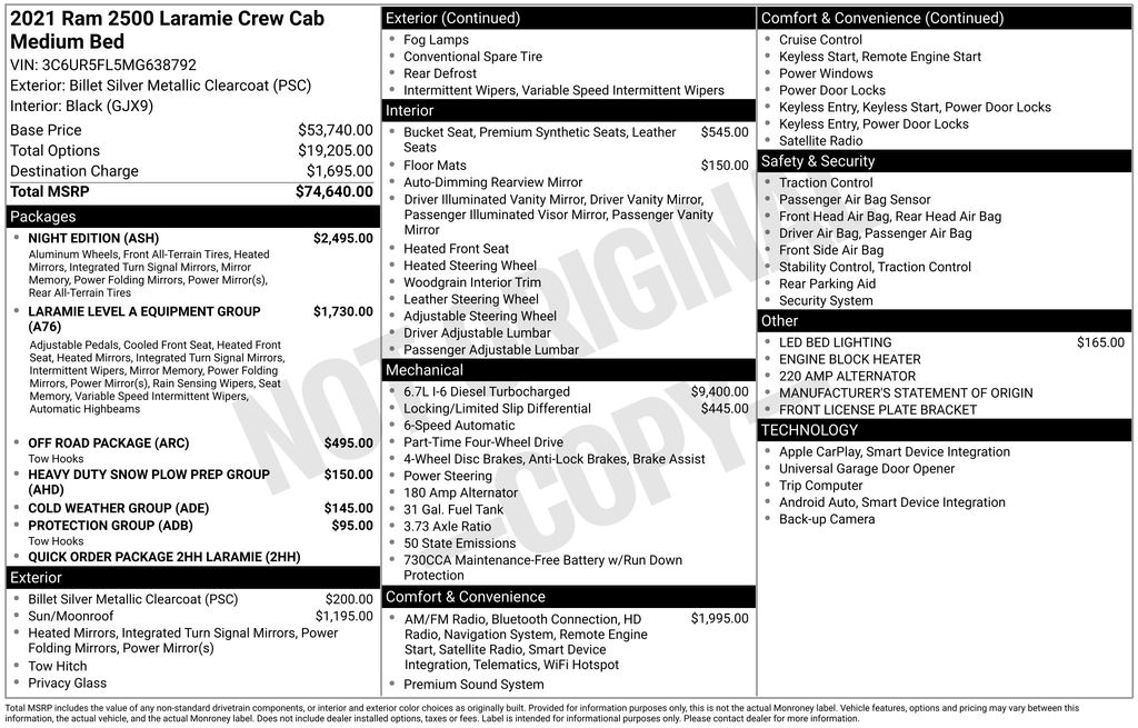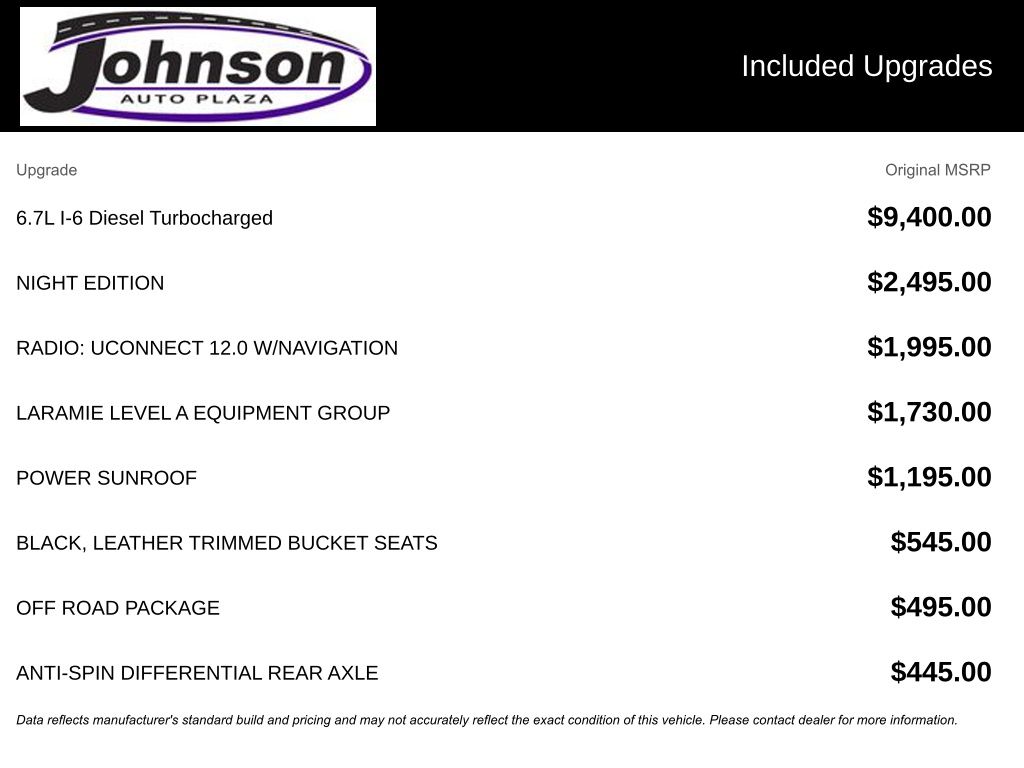 We look forward to serving you! Cold Weather Group (Engine Block Heater and MOPAR Winter Front Grille Cover), Heavy Duty Snow Plow Prep Group (220 Amp Alternator), Laramie Level An Equipment Group (2nd Row In Floor Storage Bins, Auto High Beam Headlamp Control, Exterior Mirrors w/Memory, Foam Bottle Insert (Door Trim Panel), Mirror-Mounted Aux Reverse Lamps, Power Adjustable Convex Aux Mirrors, Power Adjustable Pedals w/Memory, Power Chrome Tow Mirrors w/Convex Spotter & Memory, Radio/Driver Seat/Mirrors/Pedals Memory, Rain Sensitive Windshield Wipers, Remote Tailgate Release, and Ventilated Front Seats), Night Edition (Black Exterior Mirrors, Black Exterior Truck Badging, Black Headlamp Bezels, Black Interior Accents, Black Ram Head Tailgate Badge, Black Tail Lamp Bezels, Black Wheel Center Hub, Body Color Door Handles, Body Color Grille Surround, Gloss Black Grille Billets/Accents, Painted Front Bumper, Painted Rear Bumper, Power Black Tow Mirrors w/Convex Spotter & Memory, and Wheels: 20" x 8.0" Black Painted Aluminum), Off Road Package (Front Performance Tuned Shock Absorbers, Hill Descent Control, Off Road Decal, Off-Road Information Pages, Rear Performance Tuned Shock Absorbers, and Tow Hooks), Protection Group, Quick Order Package 2HH Laramie, FCA US LLC Certified Pre-Owned Certified, 1-Year SiriusXM Guardian Trial, 10 Speakers, 115V Auxiliary Rear Power Outlet, 12" Touchscreen Display, 2 Way Rear Headrest Seat, 3.73 Axle Ratio, 4 Way Front Headrests, 4-Wheel Disc Brakes, 4G LTE Wi-Fi Hot Spot, 5-Year SiriusXM Traffic Service, 5-Year SiriusXM Travel Link Service, 8.4" Touchscreen Display, ABS brakes, Active Noise Control System, Adjustable pedals, Air Conditioning, Alloy wheels, AM/FM radio: SiriusXM, Anti-Spin Differential Rear Axle, Apple CarPlay, Apple CarPlay/Android Auto, Auto-dimming Rear-View mirror, Automatic temperature control, Brake assist, Bumpers: chrome, Compass, Delay-off headlights, Disassociated Touchscreen Display, Driver door bin, Driver vanity mirror, Dual front impact airbags, Dual front side impact airbags, Electronic Stability Control, Electronically Controlled Throttle, For Details Visit DriveUconnect.com, Front anti-roll bar, Front Center Armrest w/Storage, Front dual zone A/C, Front fog lights, Front License Plate Bracket, Front reading lights, Front Seat Back Map Pockets, Fully automatic headlights, Garage door transmitter, Google Android Auto, GPS Antenna Input, GPS Navigation, HD Radio, Heated door mirrors, Heated Front Seats, Heated front seats, Heated Steering Wheel, Heated steering wheel, Illuminated entry, Integrated Center Stack Radio, Integrated Voice Command w/Bluetooth, Leather steering wheel, Leather Trim 40/20/40 Bench Seat, LED Bed Lighting, Low tire pressure warning, Manufacturer's Statement of Origin, MOPAR Front & Rear Rubber Floor Mats, Occupant sensing airbag, Outside temperature display, Overhead airbag, Overhead console, Panic alarm,