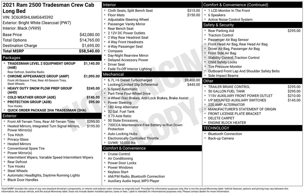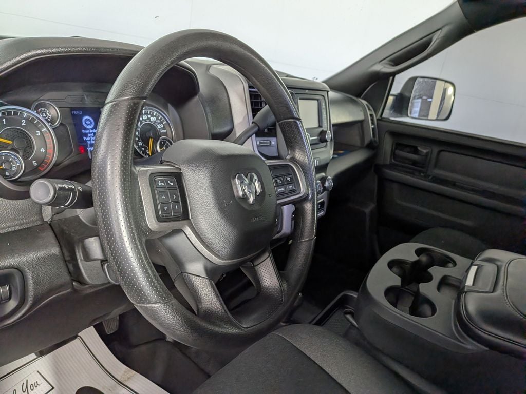 We look forward to serving you! Chrome Appearance Group (Bright Front Bumper, Bright Rear Bumper, Chrome Grille Surround, and Wheels: 18" x 8.0" Steel Chrome Clad), Cold Weather Group (Engine Block Heater and MOPAR Winter Front Grille Cover), Heavy Duty Snow Plow Prep Group (220 Amp Alternator), Protection Group (Tow Hooks), Quick Order Package 2HA Tradesman, Tradesman Level 2 Equipment Group (2 Way Rear Headrest Seat, 4 Way Front Headrests, 40/20/40 Split Bench Seat, Carpet Floor Covering, Cloth 40/20/40 Bench Seat, Front Armrest w/Cupholders, Manual Adjust 4-Way Driver Seat, Manual Adjust 4-Way Front Passenger Seat, Rear Folding Seat, Rear Power Sliding Window, Rear Window Defroster, and SiriusXM Satellite Radio), 115V Auxiliary Front Power Outlet, 17" x 7.5" Steel Styled Wheels, 3.73 Axle Ratio, 4-Wheel Disc Brakes, 400W Inverter, 50 Gallon Fuel Tank, 6 Speakers, ABS brakes, Active Noise Control System, Air Conditioning, AM/FM radio, Anti-Spin Differential Rear Axle, Black Exterior Mirrors, Brake assist, Center Hub, Compass, Dash Pass Thru Wire Circuits, Delay-off headlights, Driver door bin, Dual front impact airbags, Dual front side impact airbags, Electronic Stability Control, Electronically Controlled Throttle, Exterior 115V AC Outlet, Exterior Mirrors Courtesy Lamps, Exterior Mirrors w/Heating Element, Exterior Mirrors w/Supplemental Signals, Front anti-roll bar, Front Center Armrest w/Storage, Front License Plate Bracket, Front reading lights, Fully automatic headlights, GPS Antenna Input, Heated door mirrors, Heavy Duty Vinyl 40/20/40 Split Bench Seat, I/P Mounted Auxiliary Switches, Illuminated entry, Integrated Voice Command w/Bluetooth, Low tire pressure warning, Manufacturer's Statement of Origin, Mirror Running Lights, MOPAR Front & Rear Rubber Floor Mats, Occupant sensing airbag, Outside temperature display, Overhead airbag, Overhead console, ParkSense Rear Park Assist System, ParkView Rear Back-Up Camera, Passenger door bin, Passenger vanity mirror, Power Adjust & Heated Black Tow Mirrors, Power door mirrors, Power steering, Power windows, Radio data system, Radio: Uconnect 3 w/5" Display, Rear anti-roll bar, Rear step bumper, Speed control, Tachometer, Tilt steering wheel, Tip Start, Traction control, Trailer Brake Control, Trailer Light Check, Trailer Tow Mirrors, Variably intermittent wipers, and VoltmeteR.