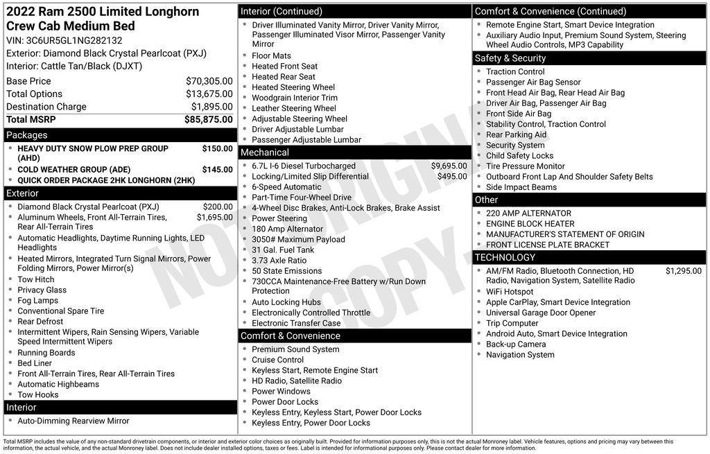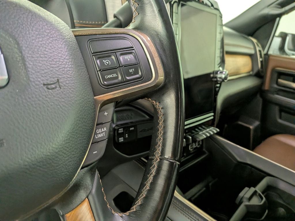 We look forward to serving you! Cold Weather Group (Engine Block Heater and MOPAR Winter Front Grille Cover), Heavy Duty Snow Plow Prep Group (220 Amp Alternator), Quick Order Package 2HK Longhorn, FCA US LLC Certified Pre-Owned Certified, 10 Speakers, 115V Auxiliary Rear Power Outlet, 12" Touchscreen Display, 2 Way Rear Headrest Seat, 3.73 Axle Ratio, 4 Way Front Headrests, 4-Wheel Disc Brakes, 4G LTE Wi-Fi Hot Spot, 8.4" Touchscreen Display, ABS brakes, Active Noise Control System, Adjustable pedals, Air Conditioning, Alexa Built-In, All R1 High Radios, All Radio Equipped Vehicles, Alloy wheels, AM/FM radio: SiriusXM with 360L, Anti-Spin Differential Rear Axle, Apple CarPlay, Apple CarPlay/Android Auto, Audio memory, Auto High-beam Headlights, Auto-dimming Rear-View mirror, Automatic temperature control, Brake assist, Bucket Seats, Bumpers: chrome, Center Hub, Compass, Connected Travel & Traffic Services, Connectivity - US/Canada, Delay-off headlights, Disassociated Touchscreen Display, Driver door bin, Driver vanity mirror, Dual front impact airbags, Dual front side impact airbags, Electronic Stability Control, Electronically Controlled Throttle, Folding Flat Load Floor Storage, For Details, Visit DriveUconnect.com, For More Info, Call 800-643-2112, Front anti-roll bar, Front Bucket Seats, Front Center Armrest w/Storage, Front dual zone A/C, Front fog lights, Front License Plate Bracket, Front reading lights, Front Seat Back Map Pockets, Full Length Premium Upgraded Floor Console, Fully automatic headlights, Garage door transmitter, Genuine wood console insert, Genuine wood dashboard insert, Genuine wood door panel insert, Global Telematics Box Module (TBM), Google Android Auto, GPS Antenna Input, GPS Navigation, HD Radio, Heated door mirrors, Heated Front Seats, Heated front seats, Heated rear seats, Heated Second Row Seats, Heated Steering Wheel, Heated steering wheel, High Back Seats, Illuminated entry, Integrated Center Stack Radio, Integrated Voice Command w/Bluetooth, Leather steering wheel, Low tire pressure warning, Manufacturer's Statement of Origin, Memory seat, Navigation System, Occupant sensing airbag, Off-Road Information Pages, Outside temperature display, Overhead airbag, Overhead console, Painted Flat Wheel-to-Wheel Side Steps, Panic alarm, ParkView Rear Back-Up Camera, Passenger door bin, Passenger vanity mirror, Pedal memory, Power 2-Way Driver Lumbar Adjust, Power 2-Way Passenger Lumbar Adjust, Power Adjust 8-Way Driver Seat, Power Adjust 8-Way Front Passenger Seat, Power door mirrors, Power driver seat, Power passenger seat, Power steering, Power windows, Premium Filigree Leather Seats, Radio data system, Radio: Uconnect 5 Nav w/12.0" Display, Radio: Uconnect 5 Nav w/8.4" Display, Radio/Driver Seat/Mirrors/Pedals Memory, Rain sensing wipers, Rear 60/40 Folding Seat, Rear anti-roll bar, Rear reading lights, Rear seat center armrest, Rear step bumper, Rear window defroster, Remote keyless entry, Security system, Selectab