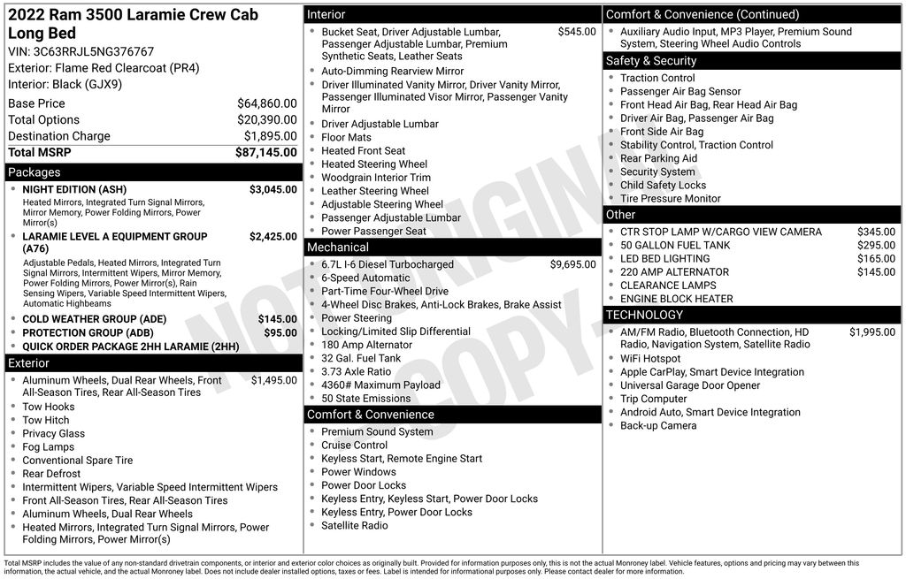 We look forward to serving you! Cold Weather Group (Engine Block Heater and MOPAR Winter Front Grille Cover), Laramie Level An Equipment Group (2nd Row In Floor Storage Bins, Auto High Beam Headlamp Control, Chrome Exterior Mirrors, Exterior Mirrors Courtesy Lamps, Exterior Mirrors w/Heating Element, Exterior Mirrors w/Memory, Exterior Mirrors w/Supplemental Signals, Foam Bottle Insert (Door Trim Panel), Mirror Running Lights, Mirror-Mounted Aux Reverse Lamps, Power Adjustable Convex Aux Mirrors, Power Adjustable Pedals w/Memory, Power Chrome Tow Mirrors w/Convex Spotter & Memory, Power-Folding Mirrors, Rain Sensitive Windshield Wipers, Remote Tailgate Release, and Trailer Tow Mirrors), Night Edition (Black Exterior Mirrors, Black Exterior Truck Badging, Black Headlamp Bezels, Black Interior Accents, Black Ram Head Tailgate Badge, Black Tail Lamp Bezels, Black Wheel Center Hub, Body Color Door Handles, Body Color Grille Surround, Gloss Black Grille Billets/Accents, Painted Front Bumper, Painted Rear Bumper, and Power Black Tow Mirrors w/Convex Spotter & Memory), Protection Group, Quick Order Package 2HH Laramie, #1 Seat Foam Cushion, 10 Speakers, 115V Auxiliary Rear Power Outlet, 12" Touchscreen Display, 2 Way Rear Headrest Seat, 220 Amp Alternator, 3.73 Axle Ratio, 4 Way Front Headrests, 4-Wheel Disc Brakes, 4G LTE Wi-Fi Hot Spot, 50 Gallon Fuel Tank, 6000# Front Axle w/Hub Ext, 8.4" Touchscreen Display, ABS brakes, Active Noise Control System, Adjustable pedals, Air Conditioning, Alexa Built-In, All R1 High Radios, All Radio Equipped Vehicles, Alloy wheels, AM/FM radio: SiriusXM, Apple CarPlay, Apple CarPlay/Android Auto, Auto-dimming Rear-View mirror, Automatic temperature control, Bluetooth Handsfree Phone & Audio, Box & Rear Fender Clearance Lamps, Brake assist, Bumpers: chrome, Center Hub, Clearance Lamps, Compass, Connected Travel & Traffic Services, Connectivity - US/Canada, CTR Stop Lamp w/Cargo View Camera, Delay-off headlights, Disassociated Touchscreen Display, Driver door bin, Driver vanity mirror, Dual front impact airbags, Dual front side impact airbags, Dual Rear Wheels, Electronic Stability Control, Electronically Controlled Throttle, Folding Flat Load Floor Storage, For Details Visit DriveUconnect.com, For More Info, Call 800-643-2112, Front anti-roll bar, Front Bumper Sight Shields, Front Center Armrest w/Storage, Front dual zone A/C, Front fog lights, Front reading lights, Front Seat Back Map Pockets, Fully automatic headlights, Garage door transmitter, Global Telematics Box Module (TBM), Google Android Auto, GPS Antenna Input, GPS Navigation, HD Radio, Heated door mirrors, Heated Front Seats, Heated front seats, Heated Steering Wheel, Heated steering wheel, High Back Seats, Illuminated entry, Integrated Center Stack Radio, Integrated Voice Command w/Bluetooth, Leather steering wheel, Leather Trim 40/20/40 Bench Seat, LED Bed Lighting, Low tire pressure warning, Occupant sensing airbag, Off-Road Information Pages, Outside temperature display, Overhead airbag, Overhead console, Panic alarm, ParkView Rear Back-Up Camera, Passenger door bin, Passenger vanity mirror, Power 8-Way Adjustable Passenger Seat, Power Adjust 8-Way Driver Seat, Power door mirrors, Power driver seat, Power passenger seat, Power steering, Power windows, Radio data system, Radio: Uconnect 5 Nav w/12.0" Display, Radio: Uconnect 5 w/8.4" Display, Rear 60/40 Folding Seat, Rear reading lights, Rear seat center armrest, Rear step bumper, Rear window defroster, Remote keyless entry, Security system, Selectable Tire Fill Alert, SiriusXM Radio Service, SiriusXM Satellite Radio, SiriusXM w/360L, Speed control, Split folding rear seat, Steering wheel mounted a