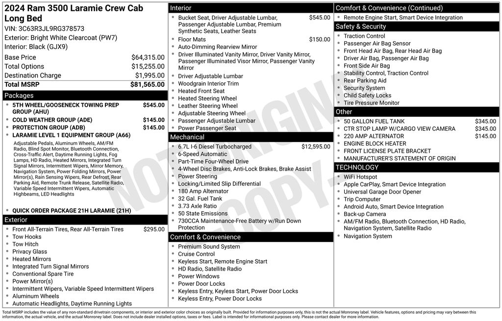 We look forward to serving you! Cold Weather Group (Engine Block Heater), Laramie Level 1 Equipment Group (18" x 8" Polished Aluminum Wheels, 2nd Row In Floor Storage Bins, 4G LTE Wi-Fi Hot Spot, Alexa Built-In, Apple CarPlay, Auto Adjust In Reverse Exterior Mirrors, Auto-Dimming Exterior Mirrors, Blind Spot & Cross Path Detection, Center Hub, Chrome Exterior Mirrors, Connected Travel & Traffic Services, Connectivity - US/Canada, Disassociated Touchscreen Display, Exterior Mirrors Courtesy Lamps, Exterior Mirrors w/Heating Element, Exterior Mirrors w/Supplemental Signals, Foam Bottle Insert (Door Trim Panel), For Details Visit DriveUconnect.com, For More Info, Call 800-643-2112, Forward & Reverse Utility Lights, Global Telematics Box Module (TBM), Google Android Auto, GPS Antenna Input, GPS Navigation, HD Radio, Integrated Voice Command w/Bluetooth, LED Reflector Headlamps, Off-Road Information Pages, ParkSense Front/Rear Park Assist System, Power Adjust Mirrors, Power Adjustable Pedals w/Memory, Power Heat Fold Memory Telescopic Mirrors, Power-Adjustable Convex Aux Mirrors, Radio: Uconnect 5 Nav w/12.0" Display, Rear Power Sliding Window, Selectable Tire Fill Alert, SiriusXM Radio Service, SiriusXM w/360L, and Trailer Tow Pages), Protection Group, Quick Order Package 21H Laramie, 10 Speakers, 115V Auxiliary Rear Power Outlet, 2 Way Rear Headrest Seat, 220 Amp Alternator, 3.73 Axle Ratio, 4 Way Front Headrests, 4-Wheel Disc Brakes, 50 Gallon Fuel Tank, 5th Wheel/Gooseneck Towing Prep Group, 8.4" Touchscreen Display, ABS brakes, Active Noise Control System, Air Conditioning, Alloy wheels, AM/FM radio: SiriusXM with 360L, Apple CarPlay/Android Auto, Auto-dimming Rear-View mirror, Automatic temperature control, Brake assist, Bumpers: body-color, Compass, CTR Stop Lamp w/Cargo View Camera, Delay-off headlights, Driver door bin, Driver vanity mirror, Dual front impact airbags, Dual front side impact airbags, Electronic Stability Control, Electronically Controlled Throttle, Folding Flat Load Floor Storage, Front anti-roll bar, Front Center Armrest w/Storage, Front dual zone A/C, Front License Plate Bracket, Front reading lights, Front Seat Back Map Pockets, Fully automatic headlights, Garage door transmitter, Heated door mirrors, Heated Front Seats, Heated front seats, Heated Steering Wheel, Heated steering wheel, High Back Seats, Illuminated entry, Integrated Center Stack Radio, Leather steering wheel, Leather Trim 40/20/40 Bench Seat, Low tire pressure warning, Manufacturer's Statement of Origin, MOPAR Front & Rear Rubber Floor Mats, Navigation System, Occupant sensing airbag, Outside temperature display, Overhead airbag, Overhead console, Panic alarm, ParkView Rear Back-Up Camera, Passenger door bin, Passenger vanity mirror, Power 8-Way Adjustable Passenger Seat, Power Adjust 8-Way Driver Seat, Power door mirrors, Power driver seat, Power passenger seat, Power steering, Power windows, Radio data system, Radio: Uconnect 5 Nav w/8.4" Display, Rear 60/40 Folding Seat, Rear reading lights, Rear seat center armrest, Rear step bumper, Remote keyless entry, Security system, Speed control, Split folding rear seat, Steering wheel mounted audio controls, Tachometer, Tilt steering wheel, Tip Start, Traction control, Trip computer, Turn signal indicator mirrors, Variably intermittent wipers, Voltmeter, and Wheels: 18" x 8.0" Polished AluminuM.