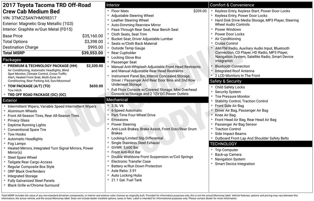 We look forward to serving you! 4WD, ABS brakes, Air Conditioning, Alloy wheels, Compass, Electronic Stability Control, Illuminated entry, Low tire pressure warning, Remote keyless entry, Traction control, 120V/400W Deck Mounted AC Power, 6 Speakers, AM/FM radio: SiriusXM, Anti-whiplash front head restraints, Auto-Dimming Inside Rear-View Mirror w/Compass, Auto-dimming Rear-View mirror, Brake assist, Bumpers: body-color, CD player, Cruise Control, Driver door bin, Dual front impact airbags, Dual front side impact airbags, Engine Immobilizer, Exterior Parking Camera Rear, Fabric Seat Trim (FD), Front anti-roll bar, Front Bucket Seats, Front Center Armrest, Front fog lights, Front reading lights, Front wheel independent suspension, Knee airbag, Leather Shift Knob, LED Daytime Running Lights, Occupant sensing airbag, ORP Black Overfenders, Outside temperature display, Overhead airbag, Overhead console, Panic alarm, Passenger door bin, Power door mirrors, Power Sliding Rear Window w/Privacy Glass, Power steering, Power windows, Radio: Entune Premium w/AM/FM/CD/Nav/App Suite, Rear step bumper, Remote Keyless Entry System, Security system, Smart Key w/Push Button Start, Speed control, Speed-sensing steering, Split folding rear seat, Steering wheel mounted audio controls, Tachometer, Telescoping steering wheel, Tilt steering wheel, TRD-Tuned Off-Road Suspension, Trip computer, Turn signal indicator mirrors, Variable Intermittent Wipers, Variably intermittent wipers, Wheels: 16" x 7" Machined Contrast Alloy, and Wide Angle Front Fog LampS.