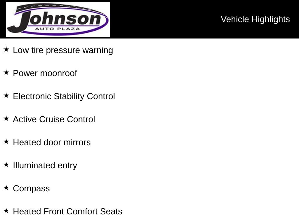 AWD, ABS brakes, Active Cruise Control, Alloy wheels, Compass, Electronic Stability Control, Front dual zone A/C, Heated door mirrors, Heated Front Comfort Seats, Heated front seats, Illuminated entry, Low tire pressure warning, Power driver seat, Power moonroof, Power steering, Power windows, Remote keyless entry, Steering wheel mounted audio controls, Traction control.